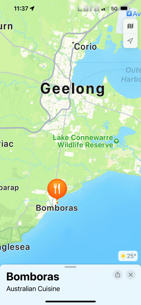 To give you a steer as to where we now sit, at the start of the Great Ocean Road the Apple Map below shows the position of Torquay west of Geelong, about 75 miles from Melbourne.