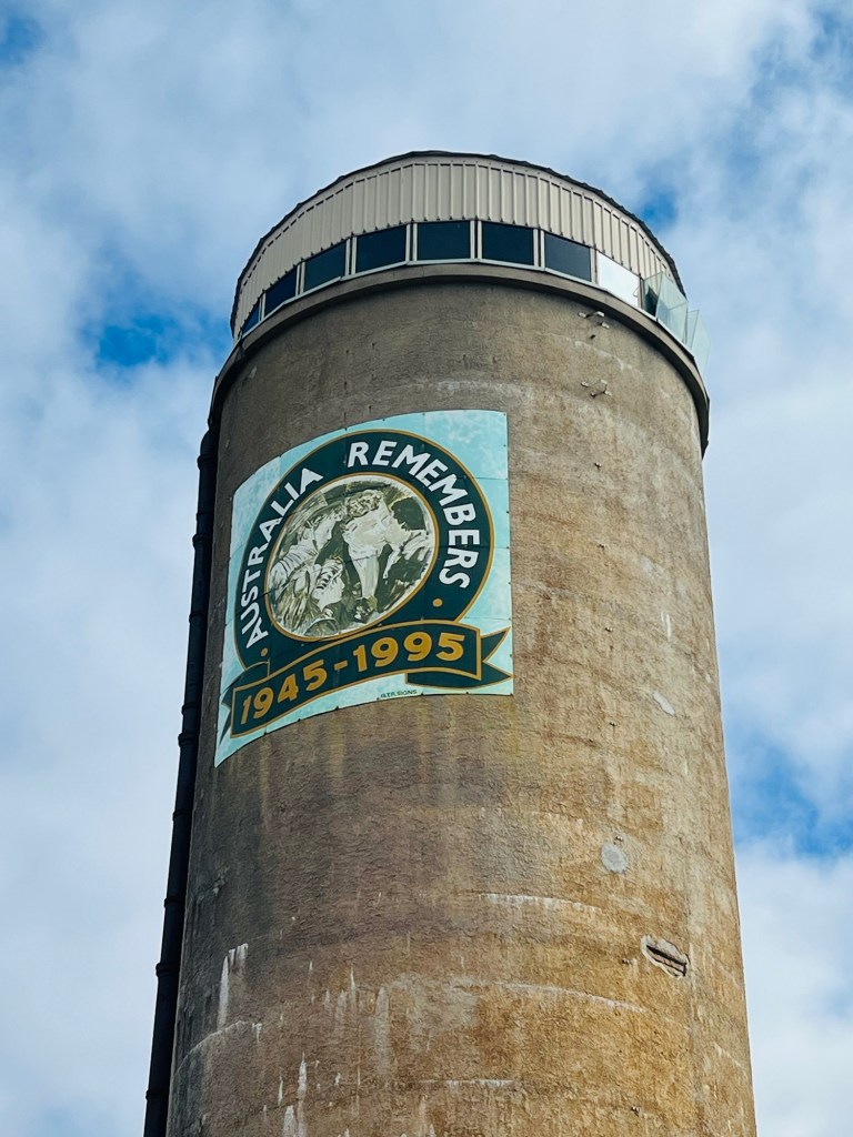 The World War II memorial site, formerly a water tower sits proudly on a hill looking over the bay and down over Portland centre.