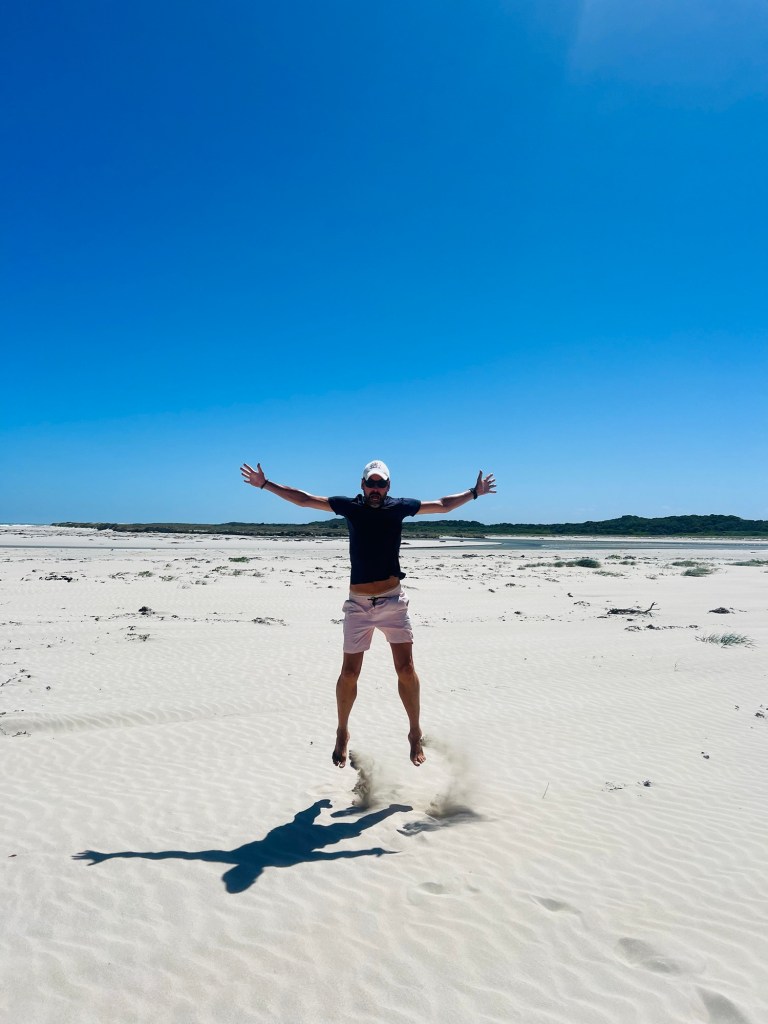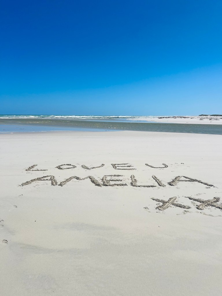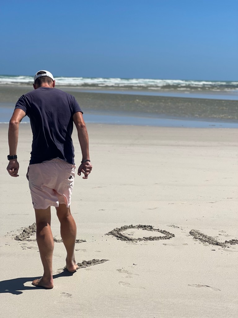 The beach was blessed with white glowing sand and with the tide coming in, Andy was able to grab the opportunity to write a message in the sand to our daughter Amelia telling her how much we miss her.