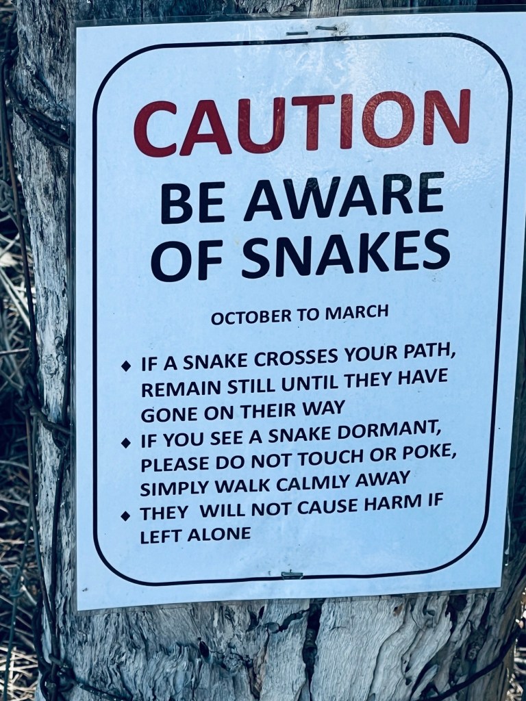 After another coffee and a date and caramel ice cream, we had an enjoyable walk across the farm in the 30 Celsius heat, taking note of the sign regarding snakes and what to do if we saw one…..