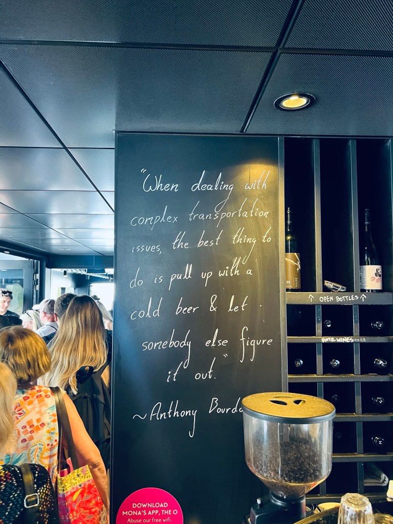 Our first stop was a ferry to MONA (museum of old and new art). This was an experience we will not forgot, in part down to the scenery, architecture but mostly the themes which is best described by the owner of the museum as ‘subversive adult Disneyland’.