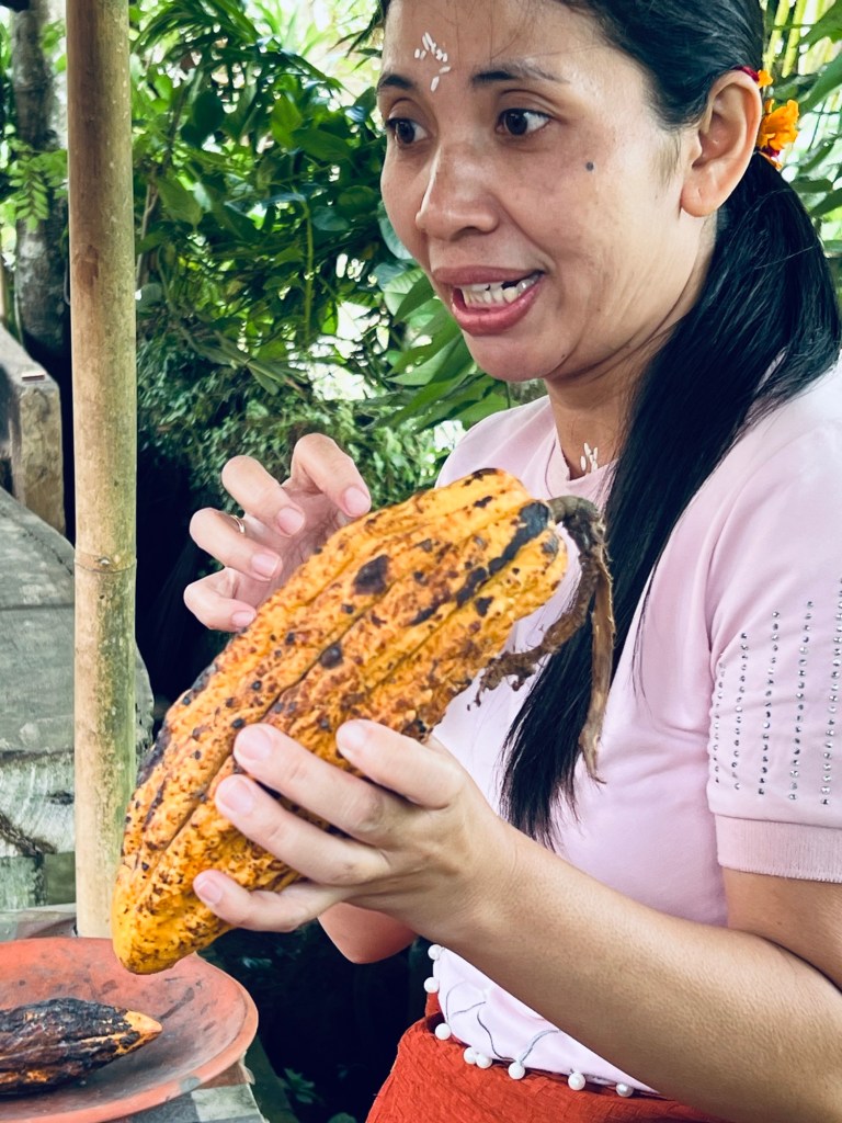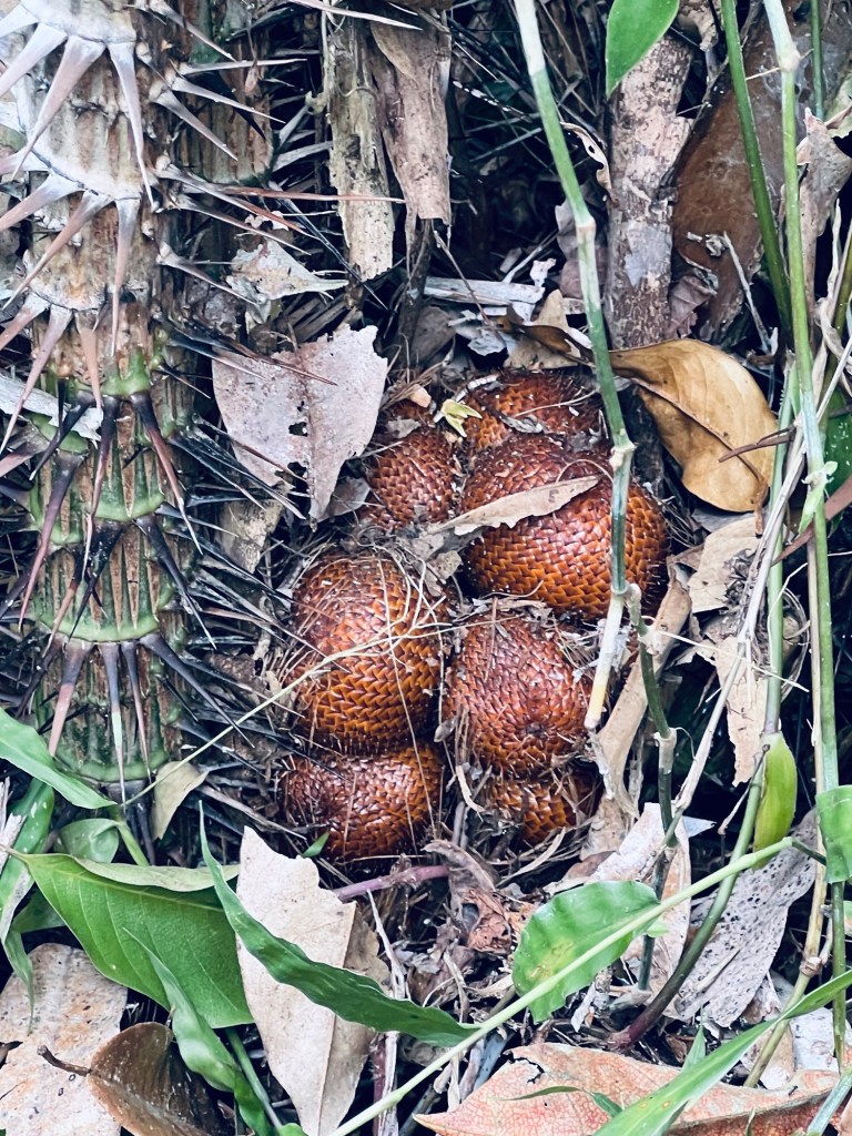 After a couple hours on the coach we arrived at a fruit farm growing cacao, bananas and snake fruit – the picture below shows them growing in the base of a tree where snakes also nest.
