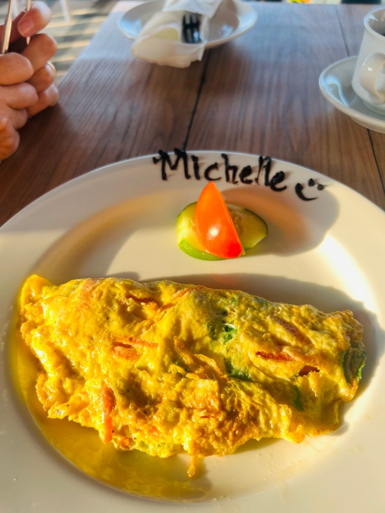 Before leaving Candi Dasa, we had a ‘personalised’ brekkie with our names in oil!