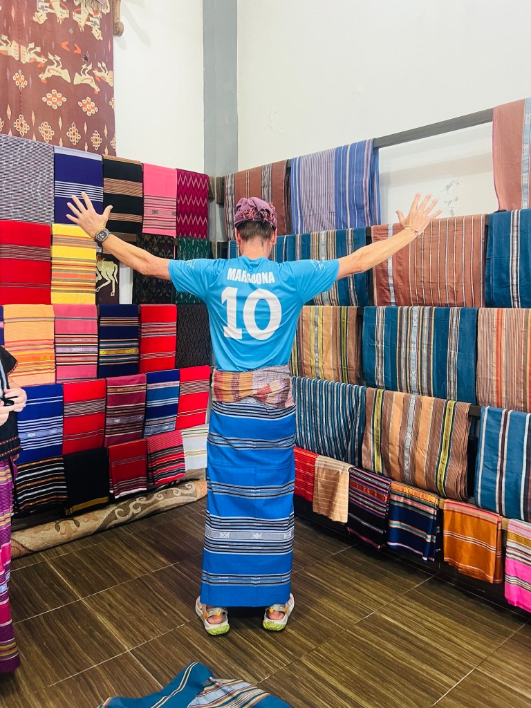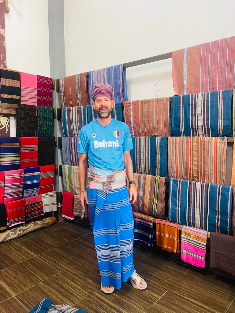 As part of the tour of the village, Andy got the chance to try on some of the garments alongside his much loved Naples football top. Not sure the two go together….