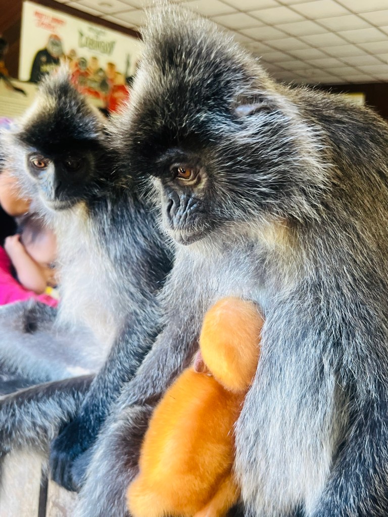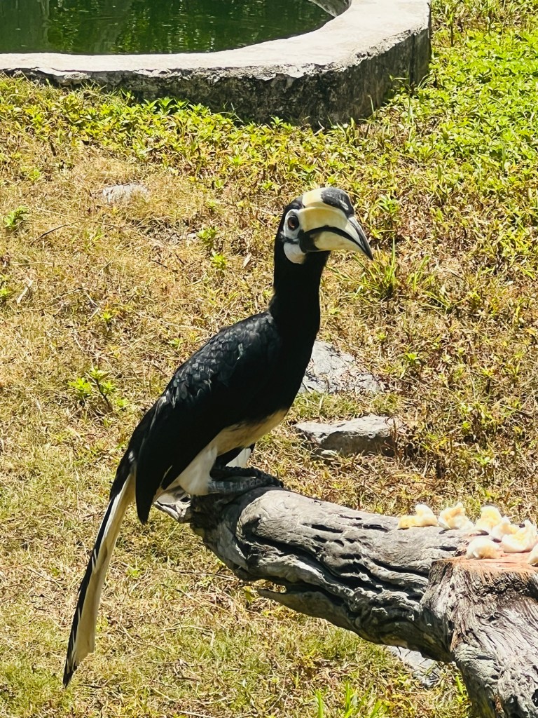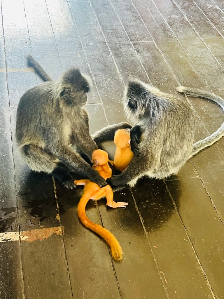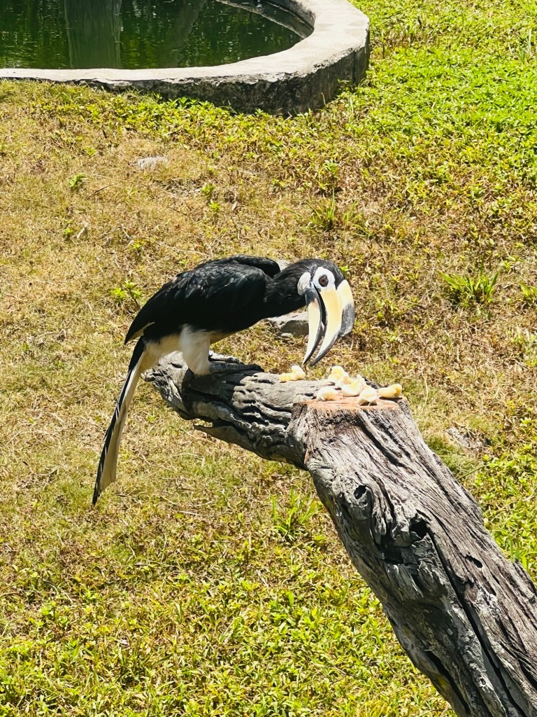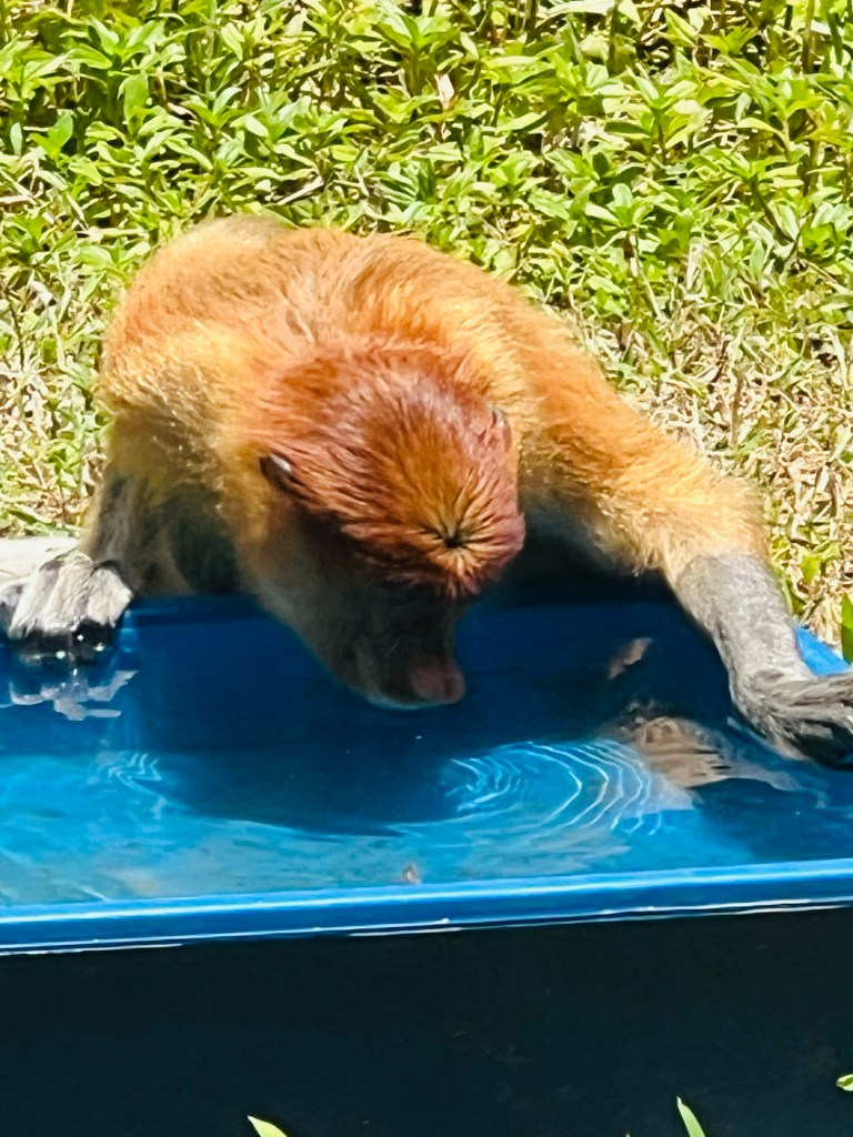 After sitting out in the heat watching the birds come down for their banana feeding, we waited for the midday lunch to be laid out for the orangutans and macque.