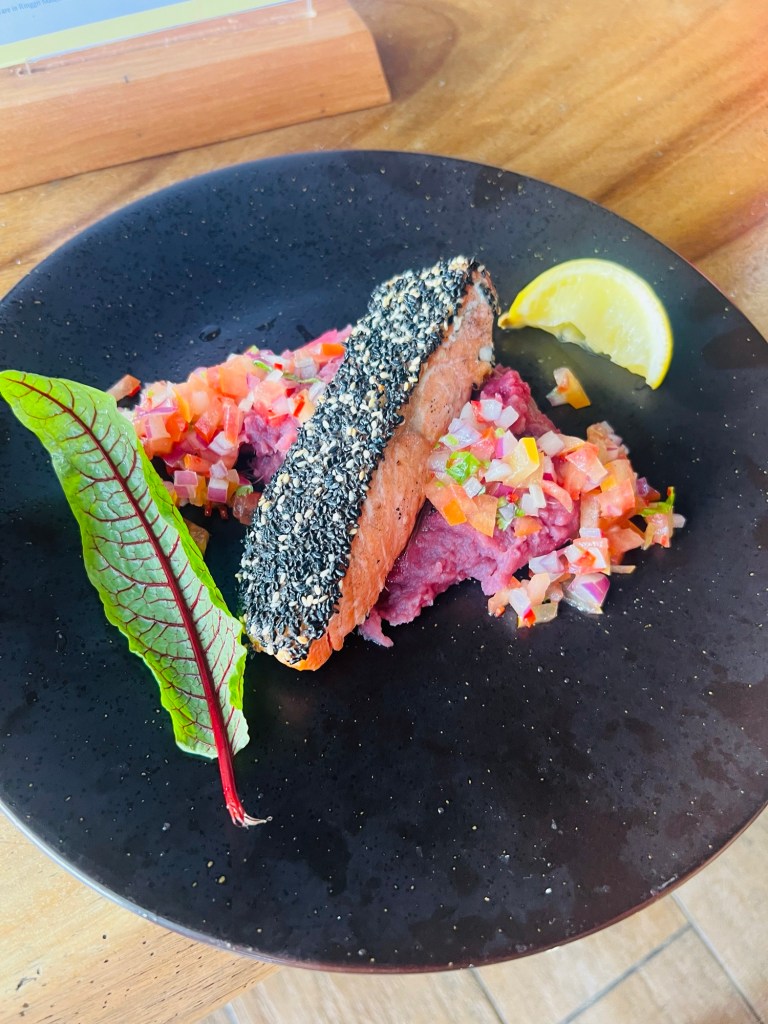 With our hunger pains kicking in, Michelle went healthy and ordered salmon and salad whilst Andy held firm and ordered french fries!