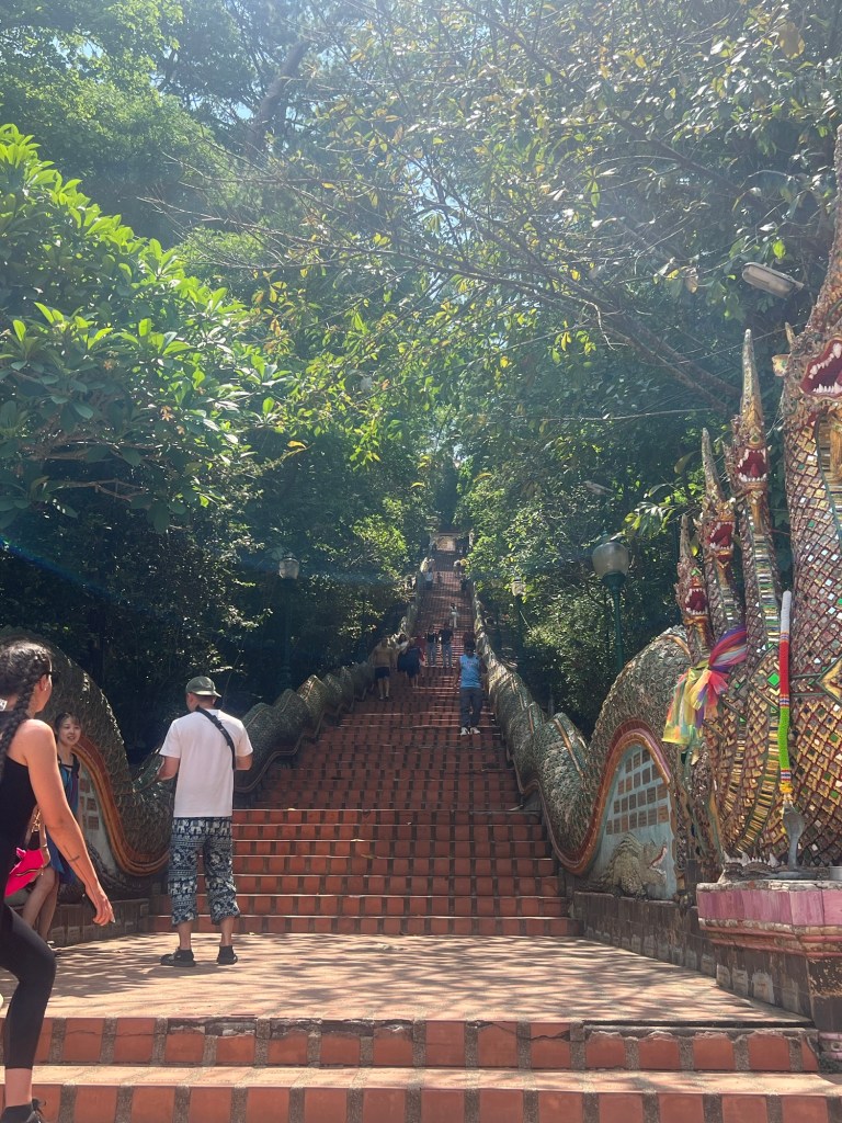 The 320 steps up to the entrance of Doi Suthep temple whilst steep, were made that bit more challenging as a result of just 3hrs sleep and the intense 36c sun. Fortunately talking to other members of the group helped to distract us and we made it to the entrance without stopping/collapsing…