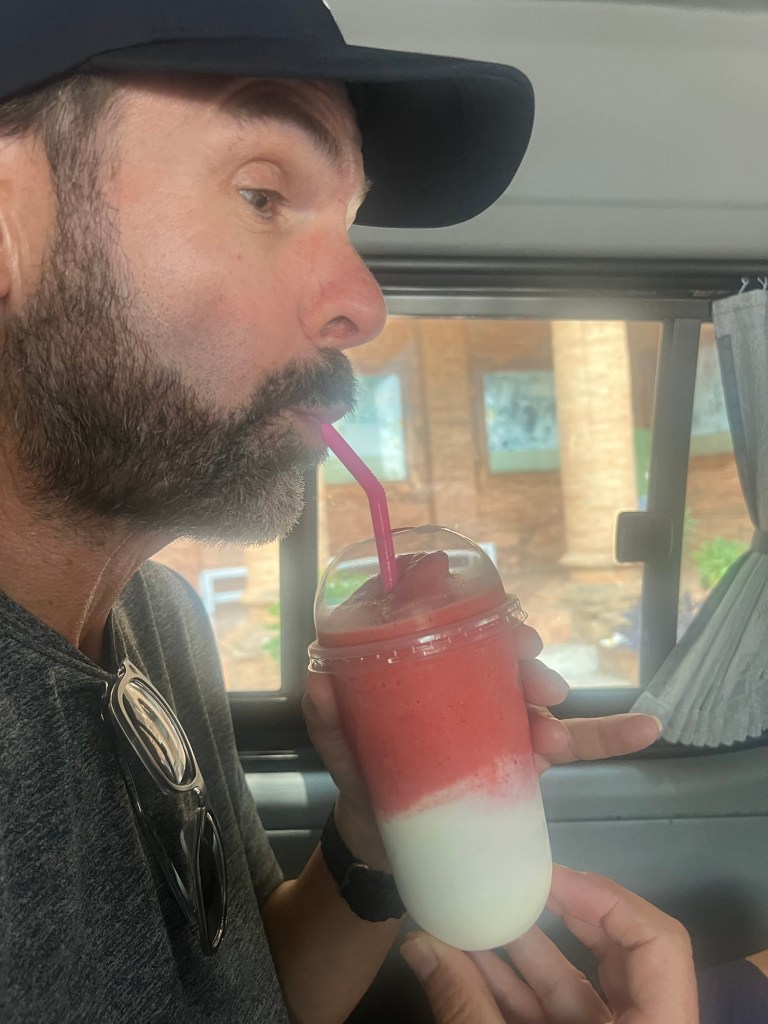 Post the temple walk it was time to relax and refuel. Andy decided to get a strawberry smoothie which he proceeded to slurp all the way back to the hotel!