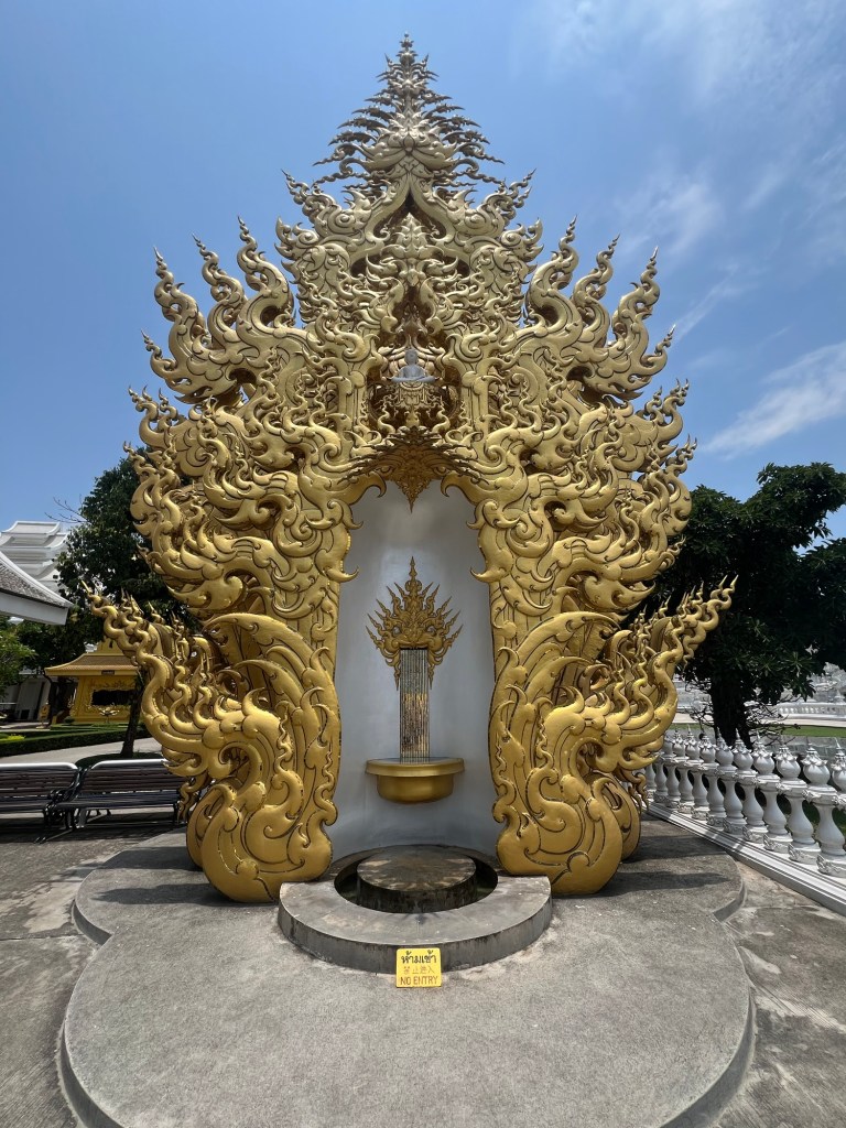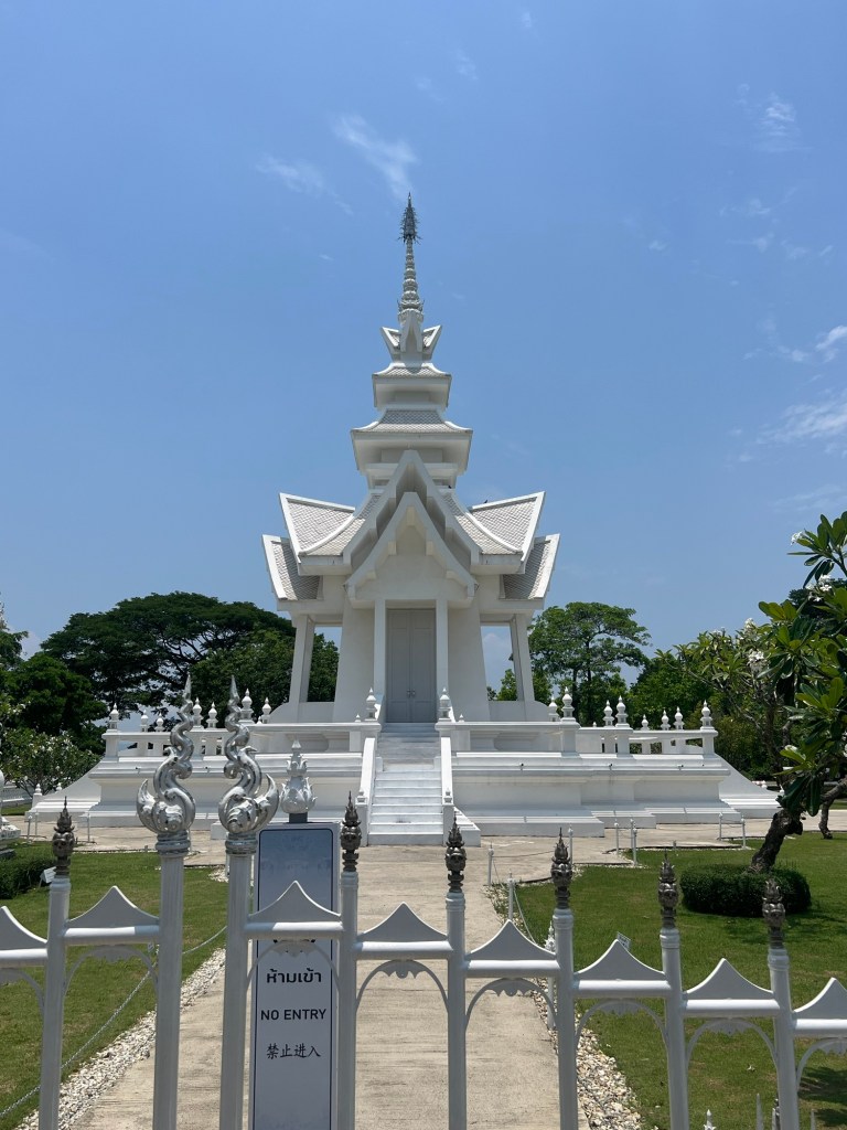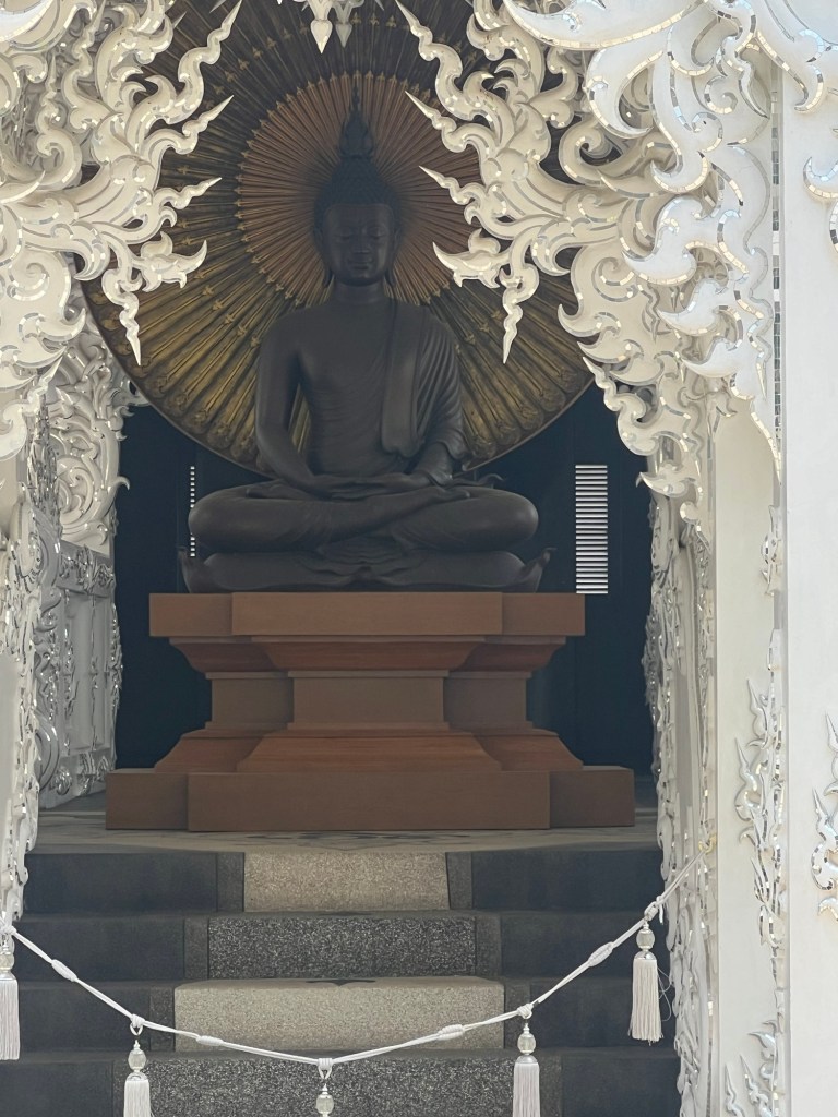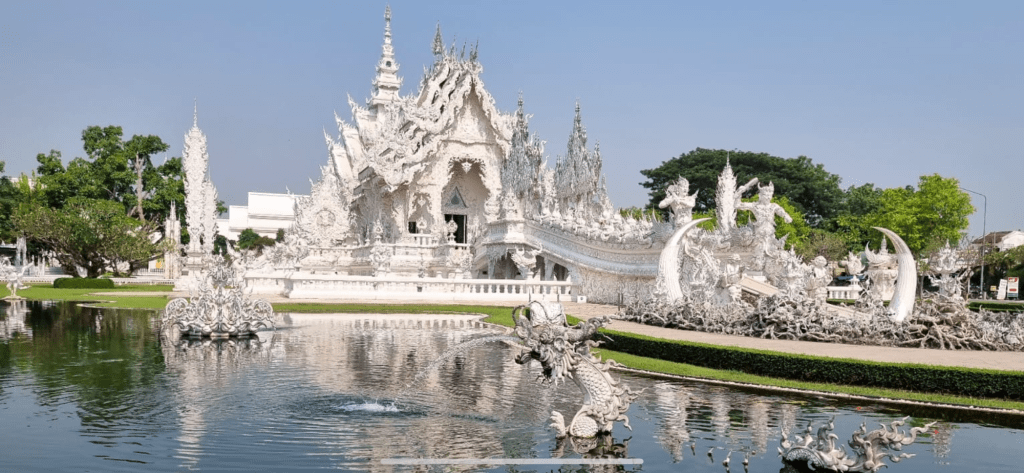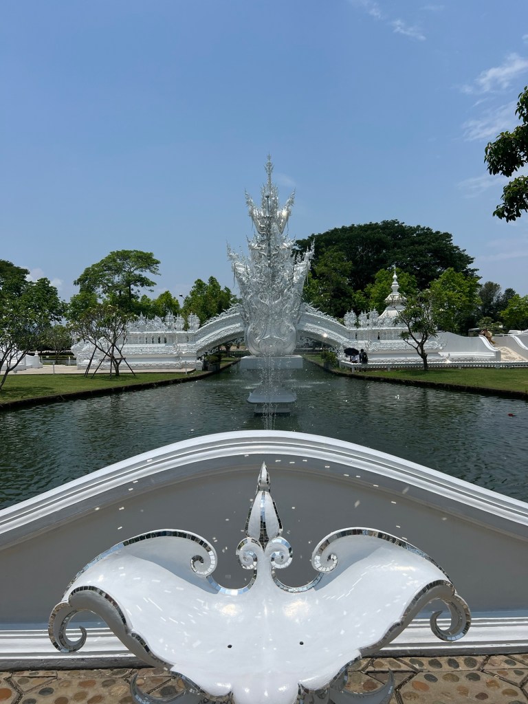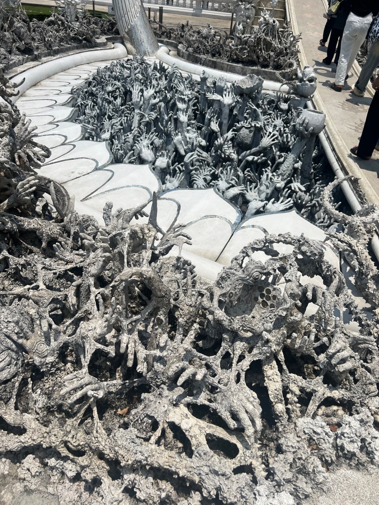 The main building at the white temple is reached by crossing a bridge over a small lake. In front of the bridge are hundreds of outreaching hands that symbolize unrestrained desire…..