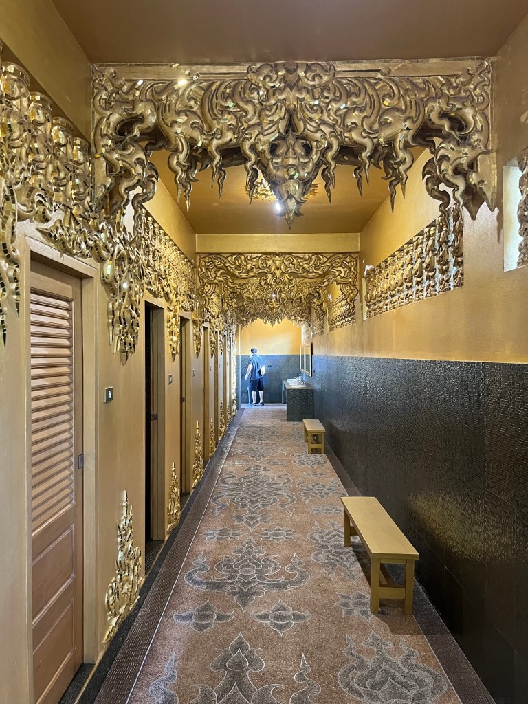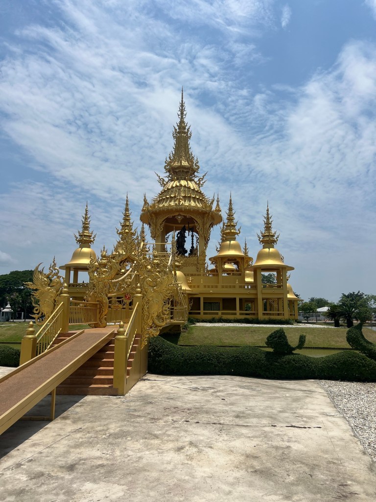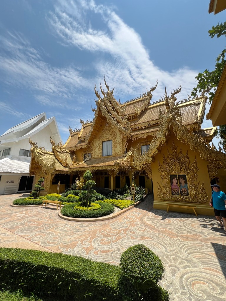 A building that stands out because of its colour is the toilets! They are ornately decorated, the golden represents the body, whereas the white represents the mind.