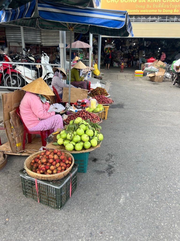 After filling up with food and coffee, we made our way to Dong Ba Market to check out the produce and marvelled at the range of fruit, veg and meats on offer – our guide advised us that people visit every day, hence the fresh food always on offer.