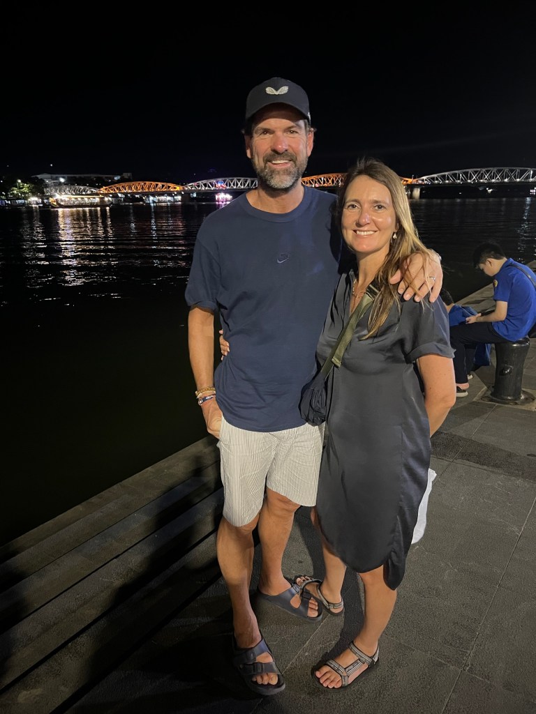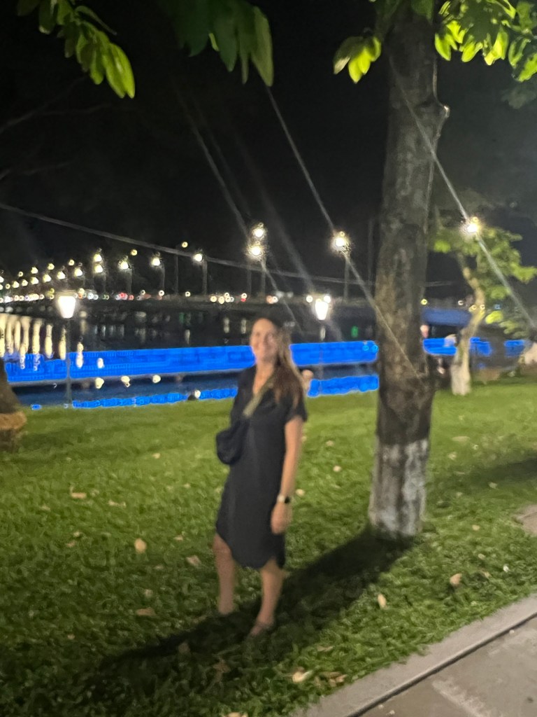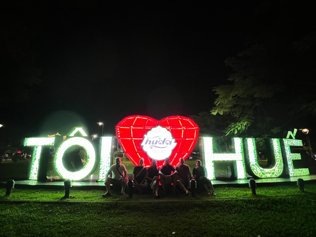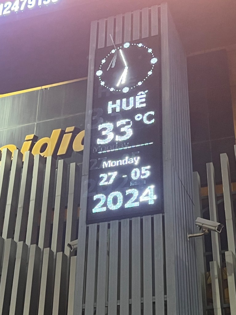 After a relaxing afternoon catching up on sleep, we then met for an early evening walking tour of Hue. It’s been a hot day and despite it being 7pm the temperature on the large neon sign near our hotel showed 33c.
