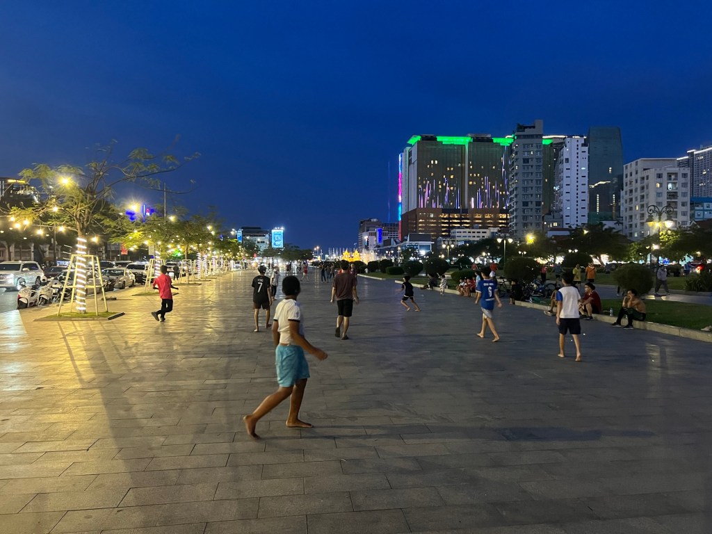 The centre of the city was buzzing with locals playing sports – Badminton seems to be very popular and there were several makeshift courts along the main boulevard drawing in a crowd. Alongside this were kids playing football with a bamboo styled ball – Andy was keen to hang around and get a game, but relented when we got close to our restaurant for this evening.