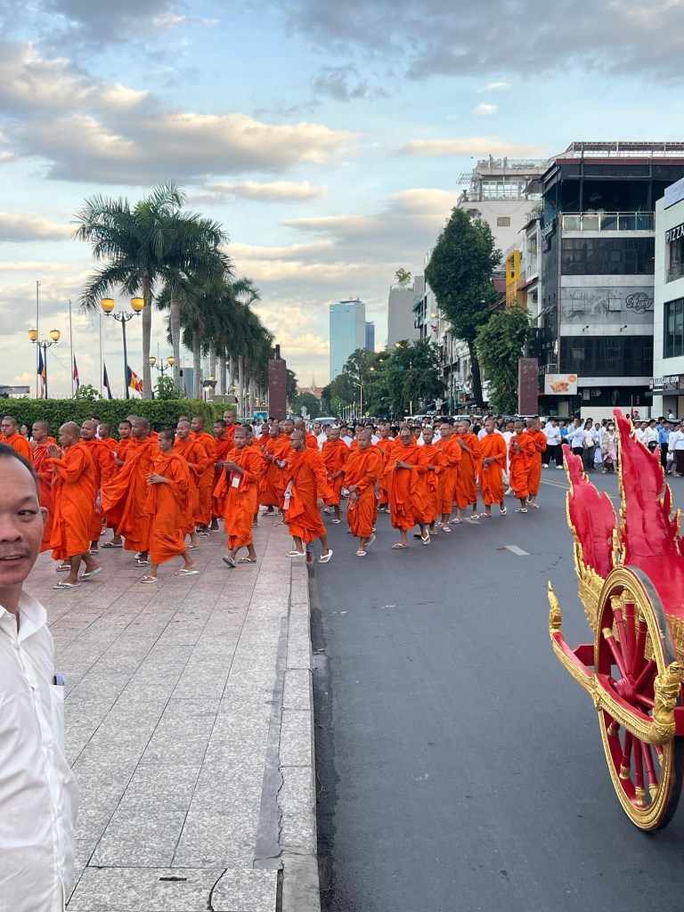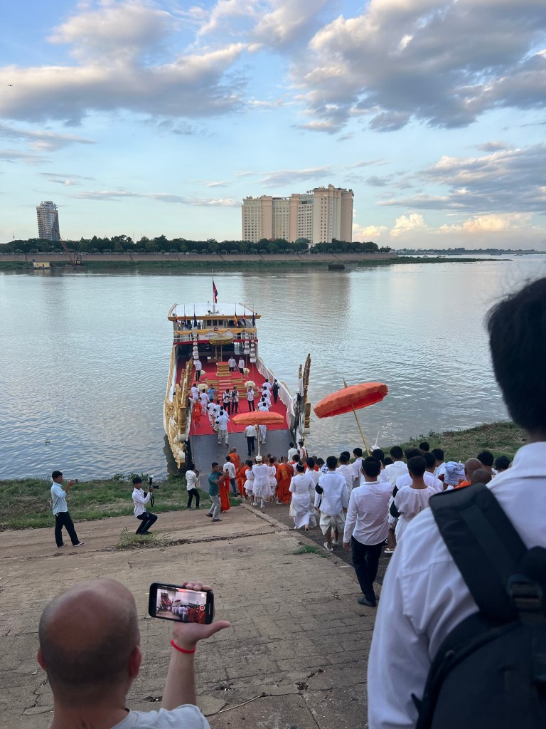After the seriousness of what we’ve seen and heard about today, we decided to have a more relaxed and fun night just the two of us. We took a tuk-tuk down to the riverfront and by chance came across the funeral procession for a high ranking monk whose body has been lying in state for the last 100 days.