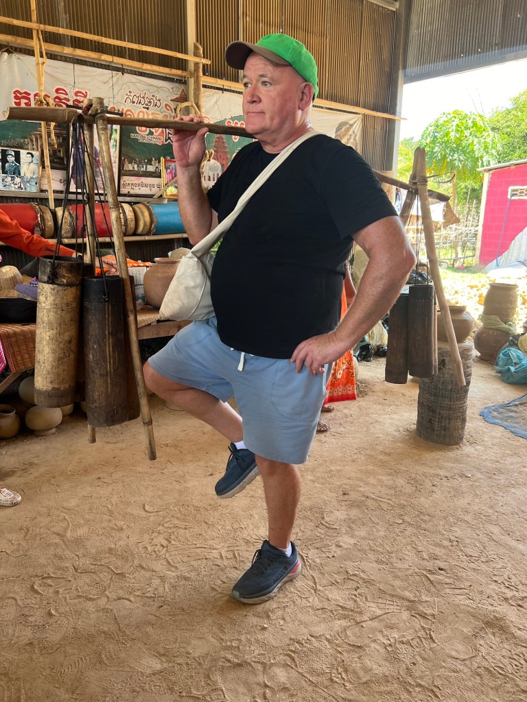 Shaun, one of our English compatriots on the tour picked up the water carrier and then performed his best ballet holds standing on one leg!
