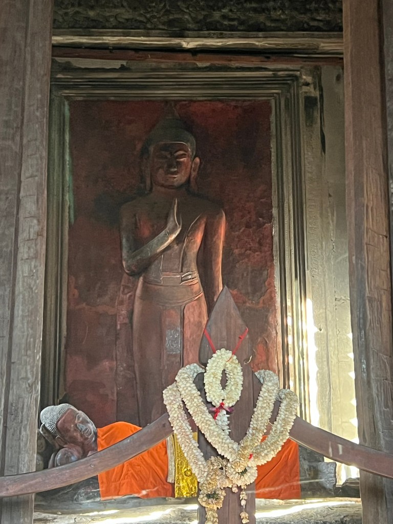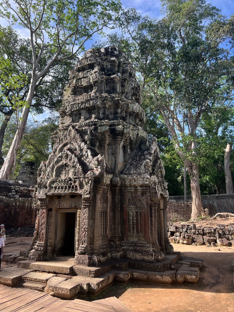 Coming upon the temple we were struck by the giant strangler fig trees growing out of the roof of the building. Nature has interwoven itself to such a degree, that were these old trees to be removed most likely the buildings would collapse.