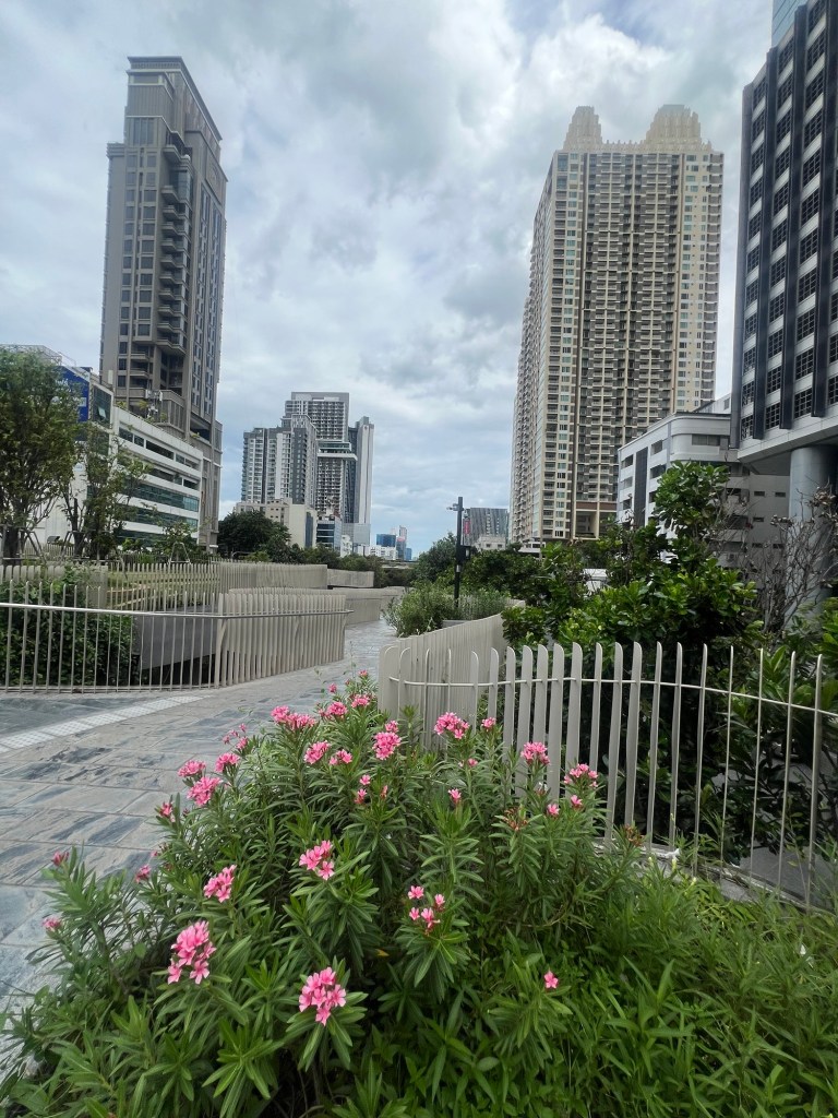 The view from the bathroom looks out over the many skyscrapers in the Sathon area.