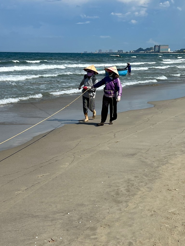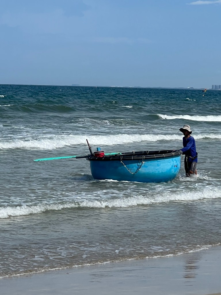 Our walk along the beach brought us into contact with local fishermen, whose small circular boats sit on the sand, they still wear traditional dress as they fish as they have done for hundreds of years. All this against a backdrop of a burgeoning modern city skyline.