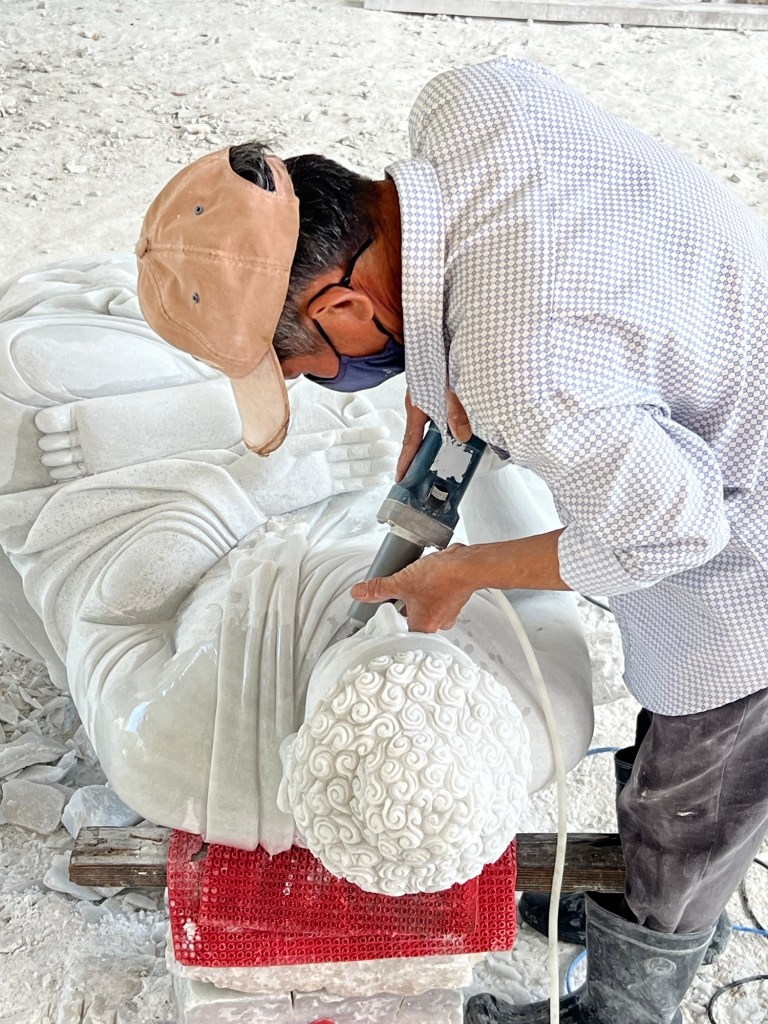 The statue leans on the mountain, facing the sea, the kind eyes looking down, a hand exorcizes while the other hand is holding a bottle of holy water sprinkling peace to the offshore fishermen