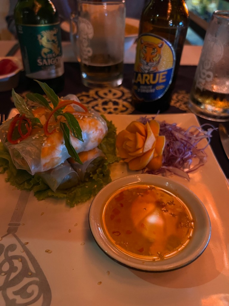 After a hunt to find the restaurant we eventually found the place and were instantly impressed by our table spot, sitting on the veranda over looking the street and river beyond. The food was a mix of Vietnamese and Indian, so we tried a bit of both tapas style accompanied by a cool Saigonese lager 333.