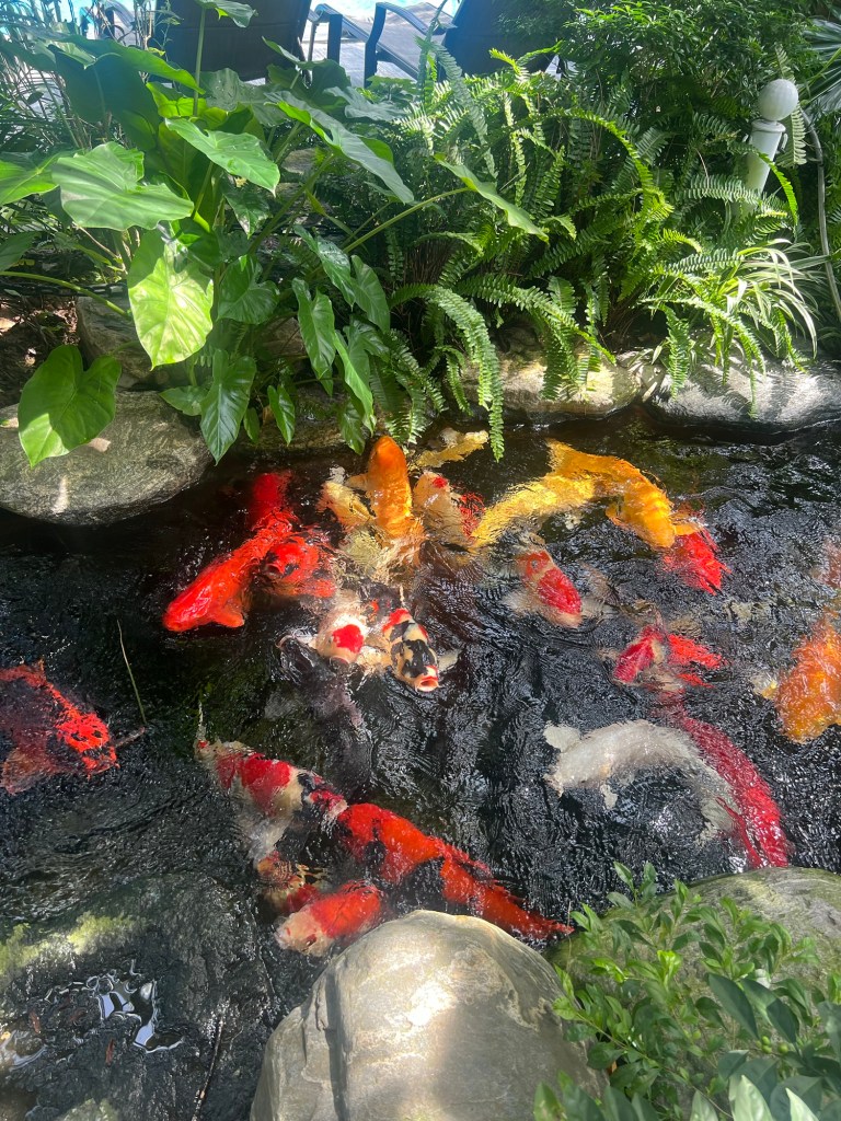 The hotel has a great swimming pool and alongside that a carp pond, full of very well fed fish.