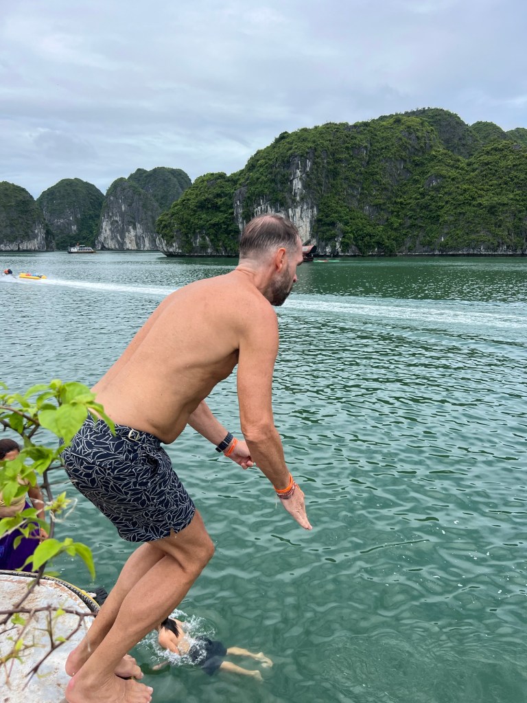 Watching some of the younger and more daring guests on the boat, Andy started to work up the courage to follow and was soon jumping in, although with less aerodynamic dives!