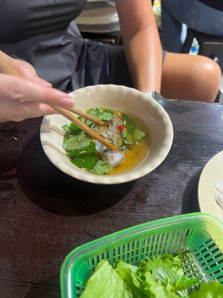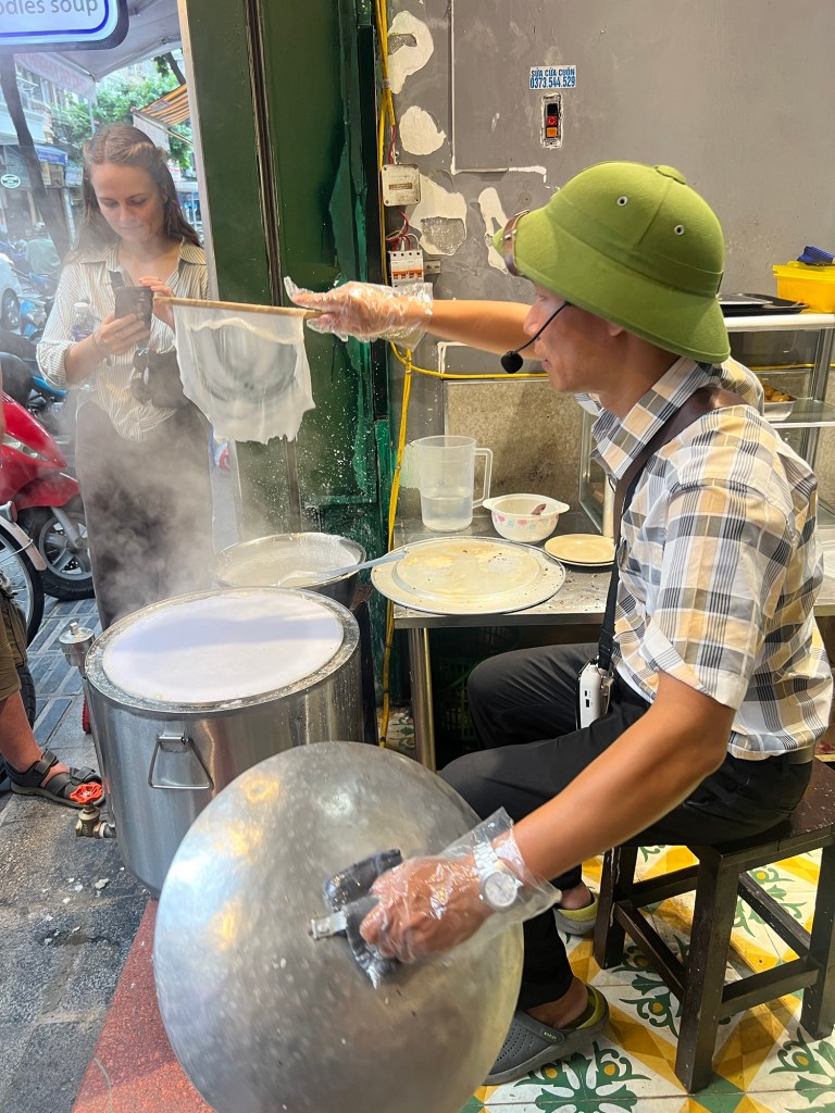 Our first food stop was to watch the making of rice paper rolls. Despite looking quite plain on first viewing, the rolls along with a dip of fish soup with onions, chilly and mint proved delicious.