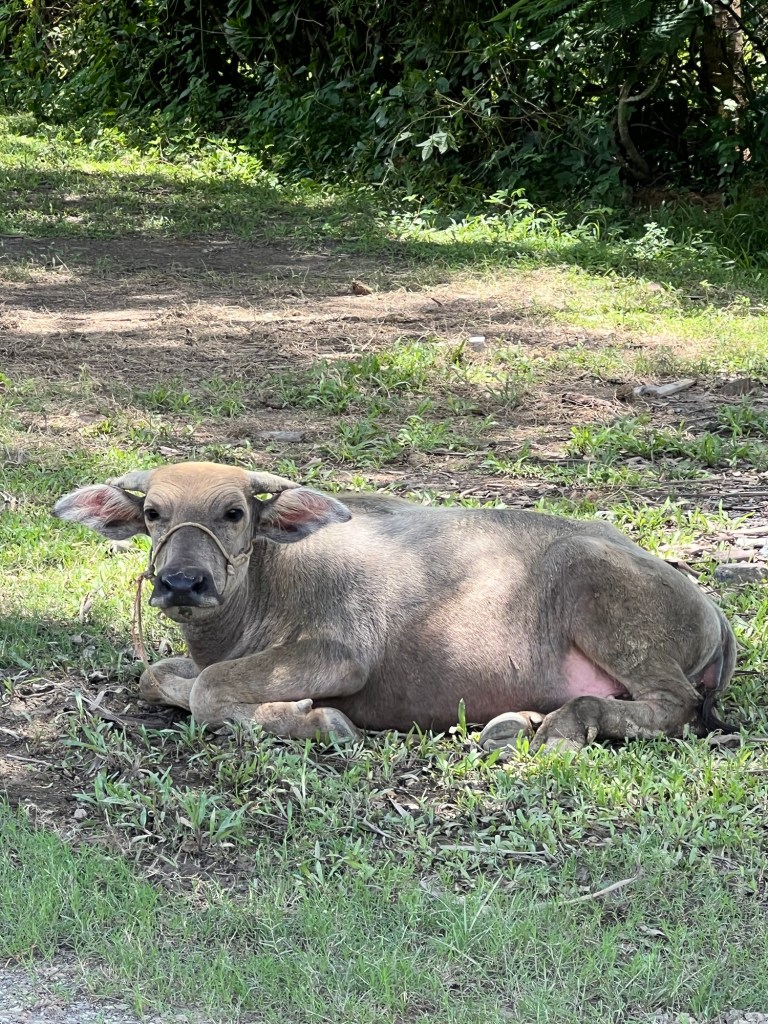 Behind the restaurant we went in search of our bikes and had to navigate around one of the families animals resting in the field.