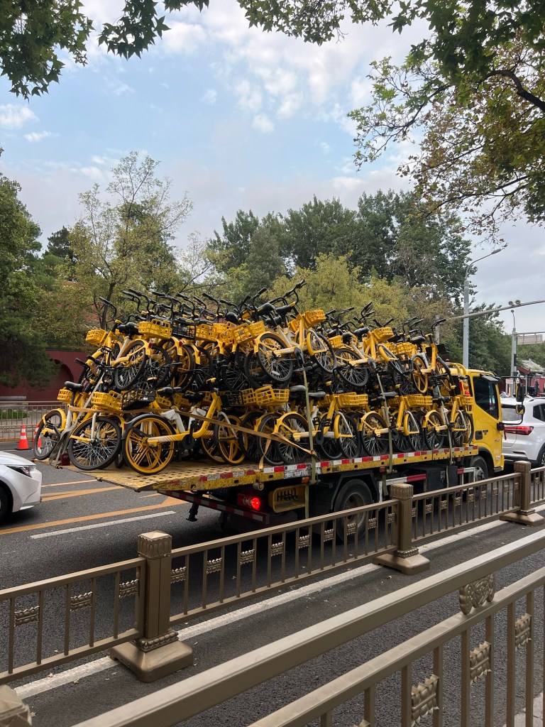 As we ebbed our way back to the hotel, we came across a van carrying some of the many millions of bikes that are available to hire in Beijing.