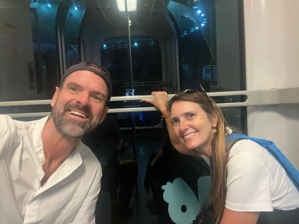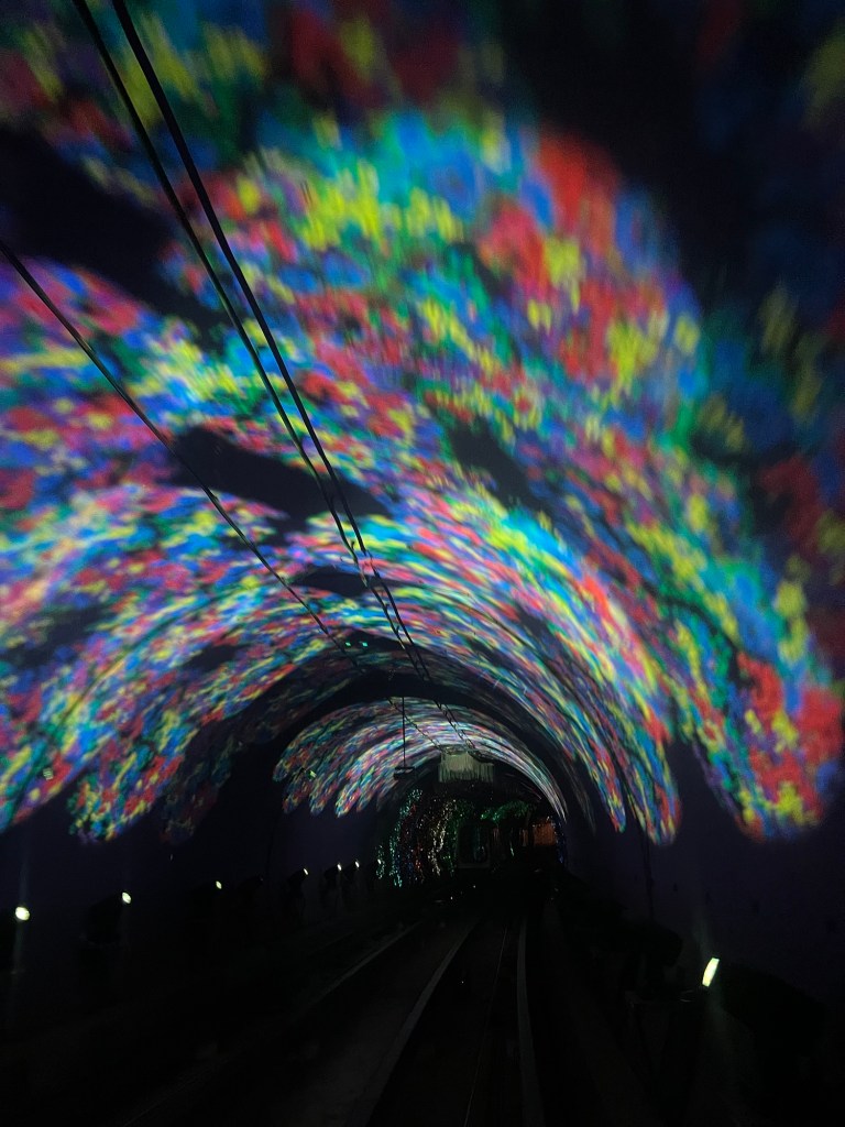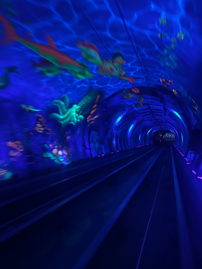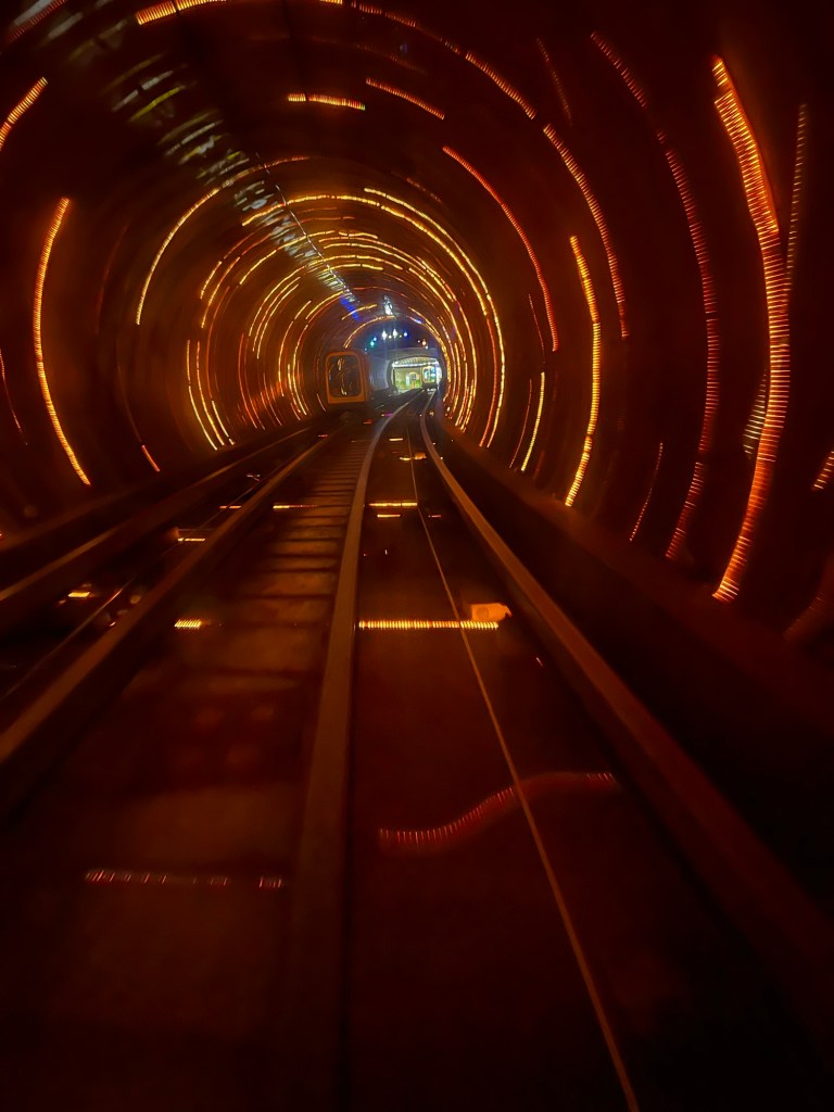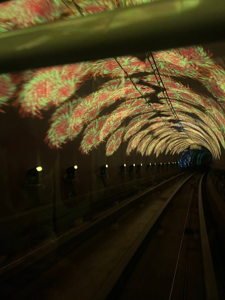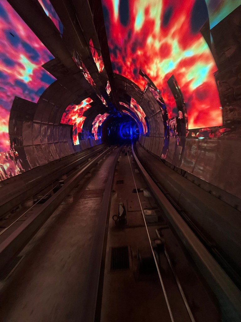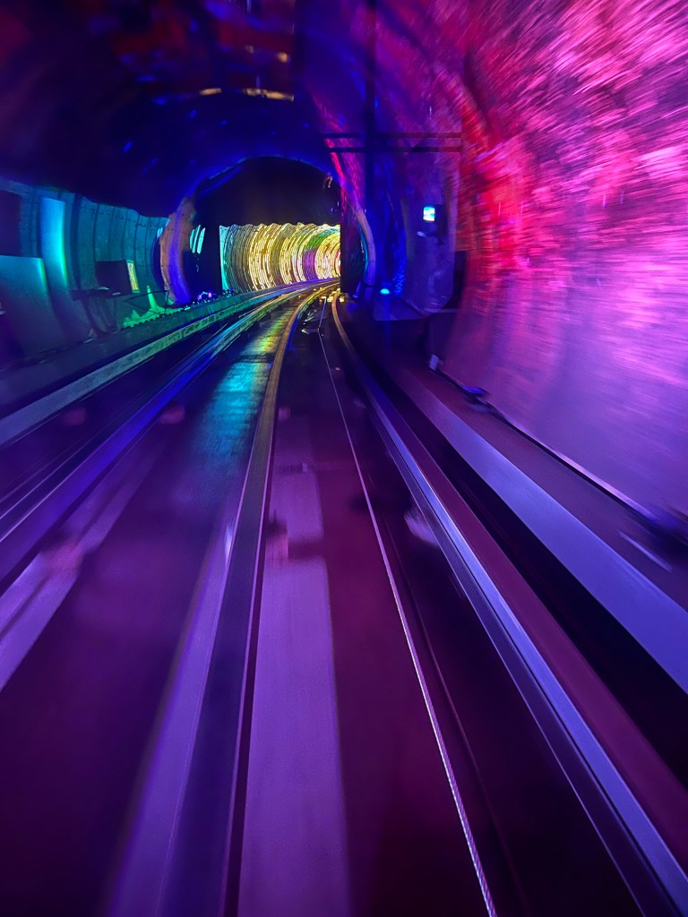 We boarded the passenger-carrying train, a fully automatic rail vehicle towed by a cable and off we went into a light show to end all light shows!