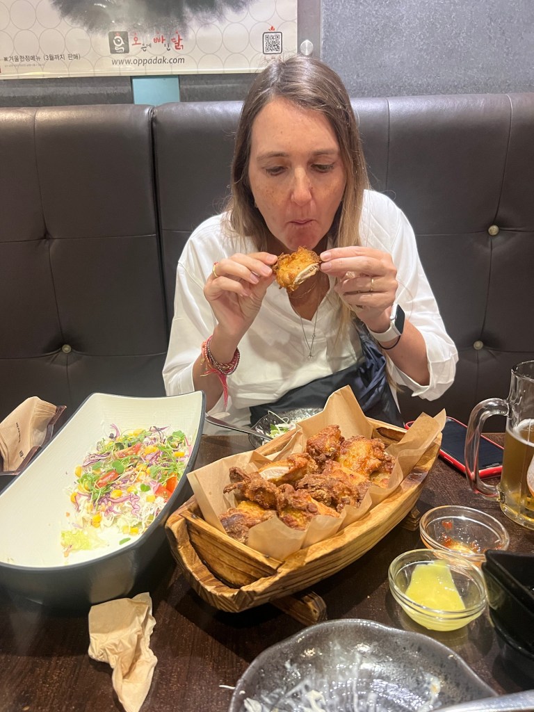 This evening we reverted to the culinary delights of Korea with BBQ chicken at OPPADAK in the centre of Myeongdong restaurant area. The place specialised in chicken in all its various forms and when the food arrived it could have fed a table of six, never mind just the two of us. Fortunately we were both hungry and determined not to leave anything.