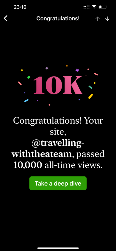 As a final note we are pleased to celebrate that we have surpassed 10,000 views of the blog since we started our adventures 10 months or so ago. Thank you for reading and keeping up to date with our tour and we hope to continue to encourage travel and entertain along the way.