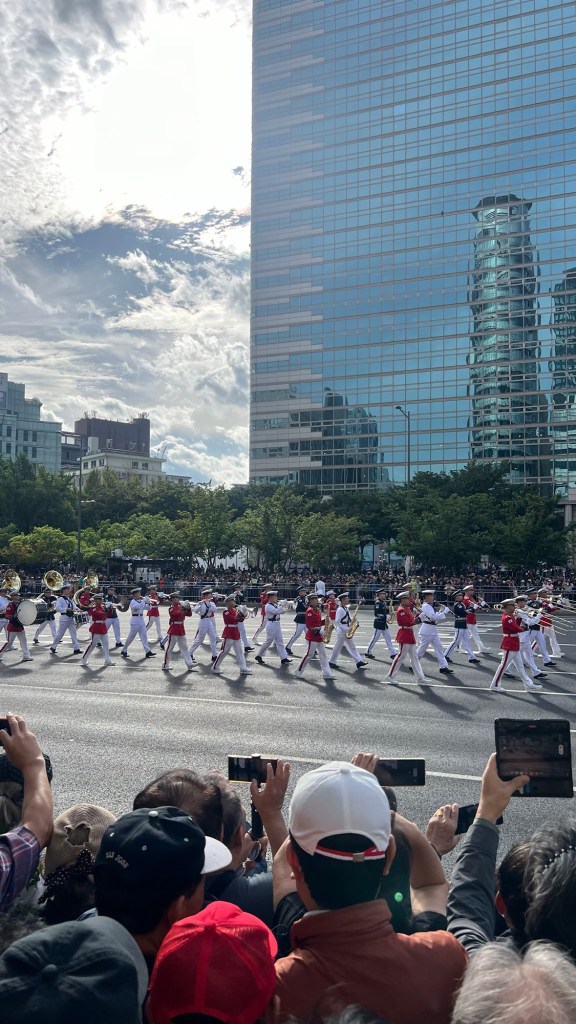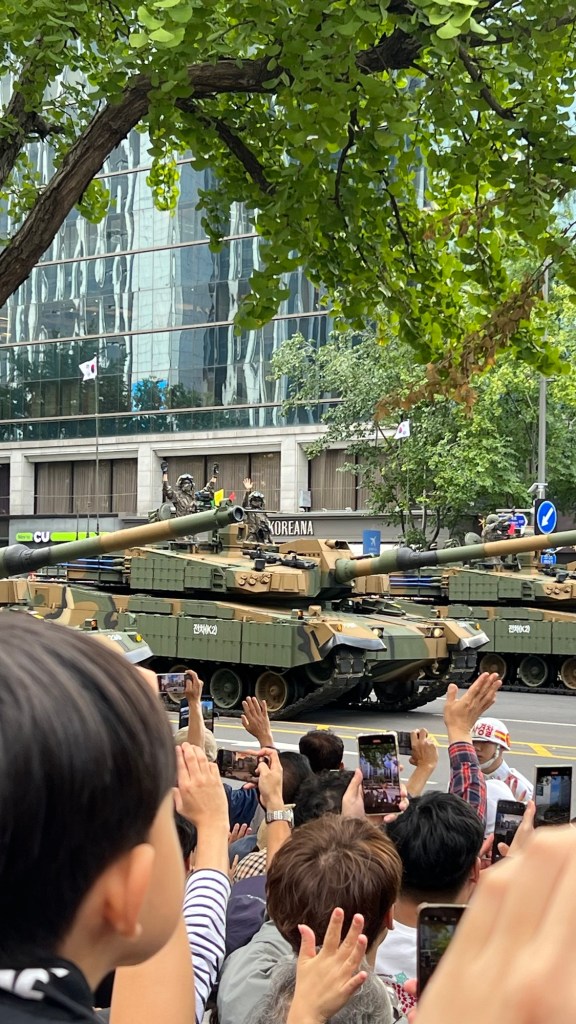 As it’s a national holiday today the locals were out in large numbers to watch the spectacular parade of military hardware including planes, tanks and not forgetting the marching bands etc.