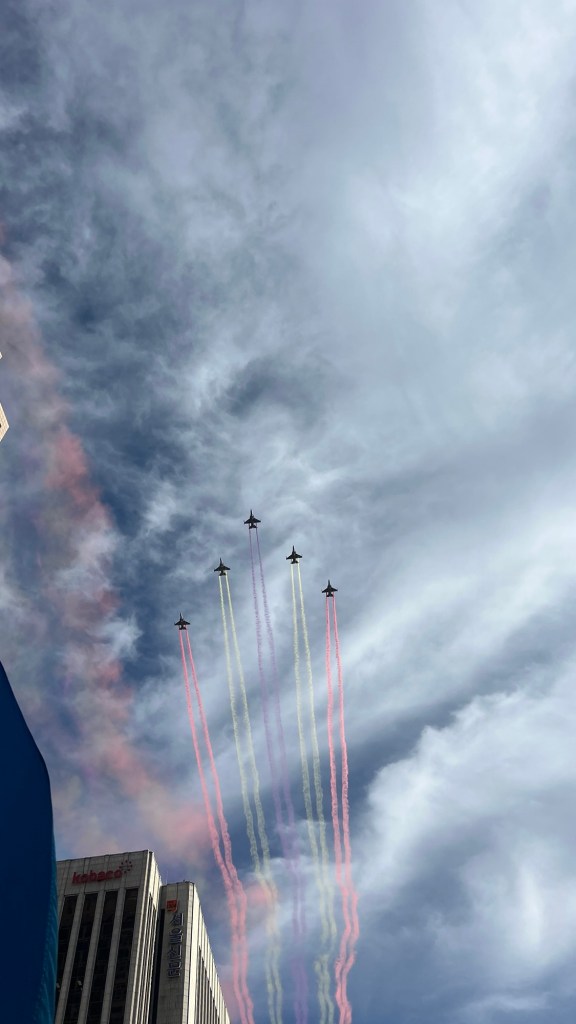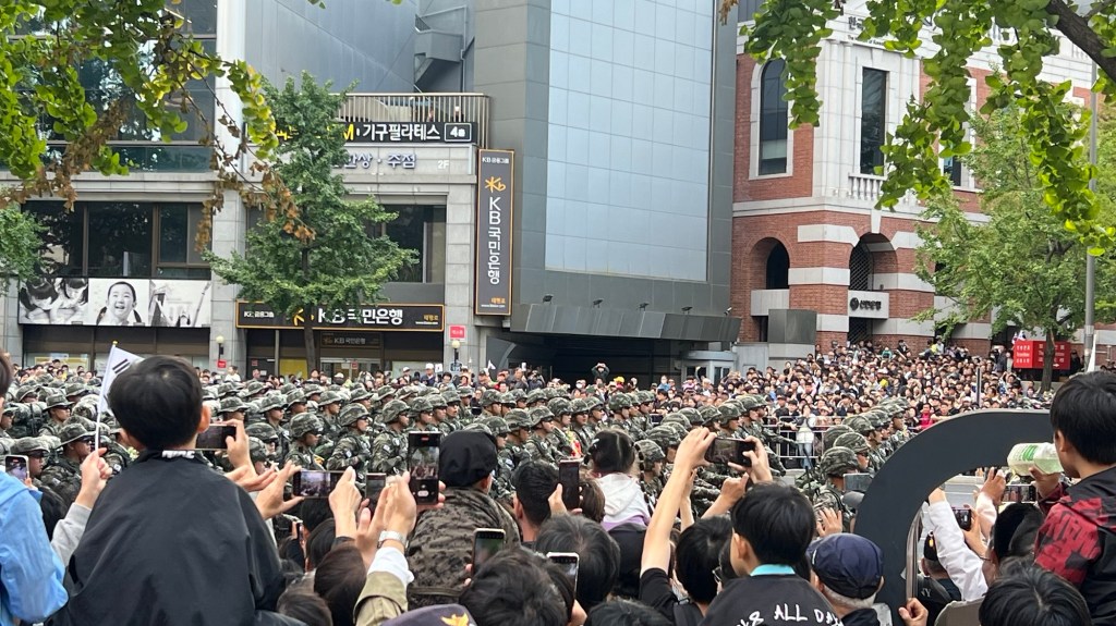With the military procession due to start around 4pm, we wandered along the urban stream to its source and to Seoul City Hall, where we found a good spot to watch the Korean military parade.