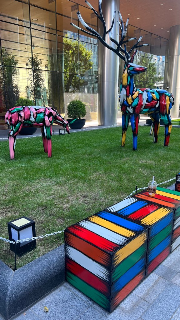 Leaving the hotel around 9.15am, we passed a multicoloured animal kingdom, outside a funky office building opposite to where we are staying.