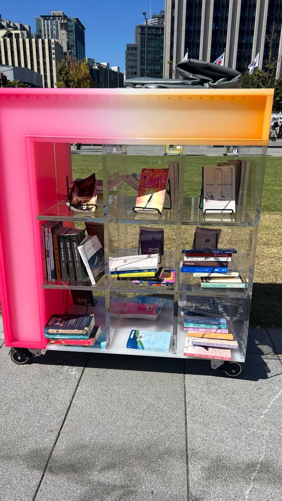 As we idled our way to the Gyeongbokgung Palace we walked past another outdoor library, a thing we’d never heard or seen of until we arrived in Seoul a week ago.
