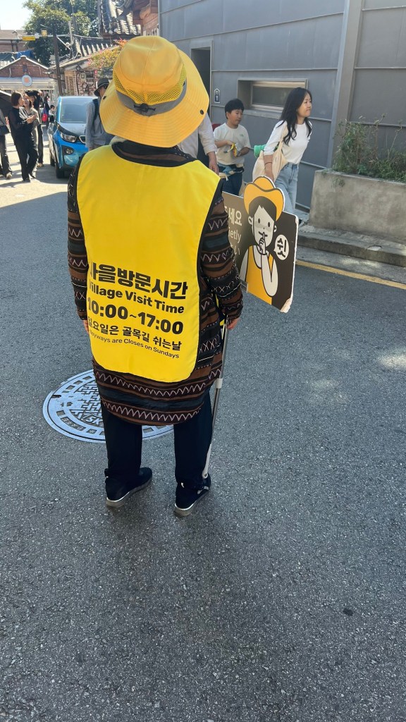 Up at the Bukchon Village, we were under surveillance from the guarding patrons in yellow reminding us to be quiet as this was an area that people still live and work in. Must admit we aren’t sure if we’d be happy for people to march up to our doors and get photos on our steps and hang around the windows!