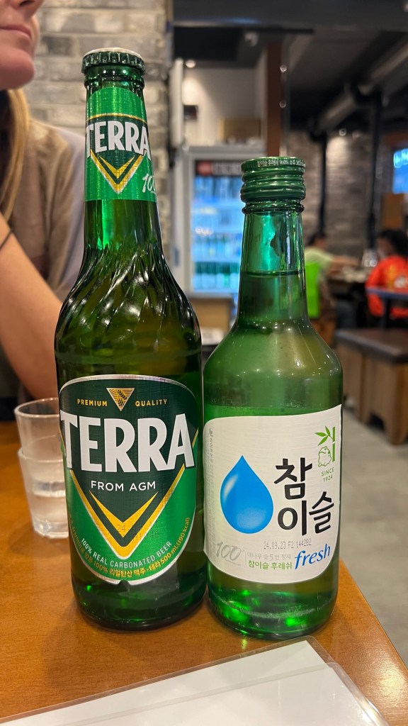 Once we had finished the meat and kimchi, Andy was able to help reduce the remaining soju, although we couldn’t finish the whole bottle and ended up gifting it to a group of young Korean men on the next table.