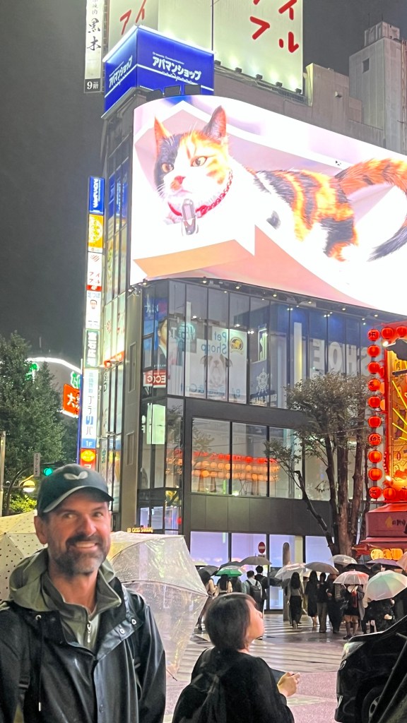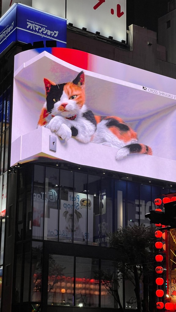 We returned to the Shinjuku cat (3D billboard). This digital calico cat looks incredibly realistic and has become a beloved favourite, with the cat appearing at certain times of the day. It’s one of the best examples of Tokyo’s cutting edge digital art.