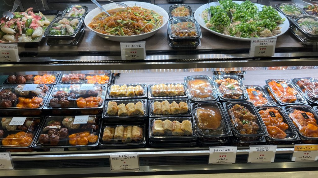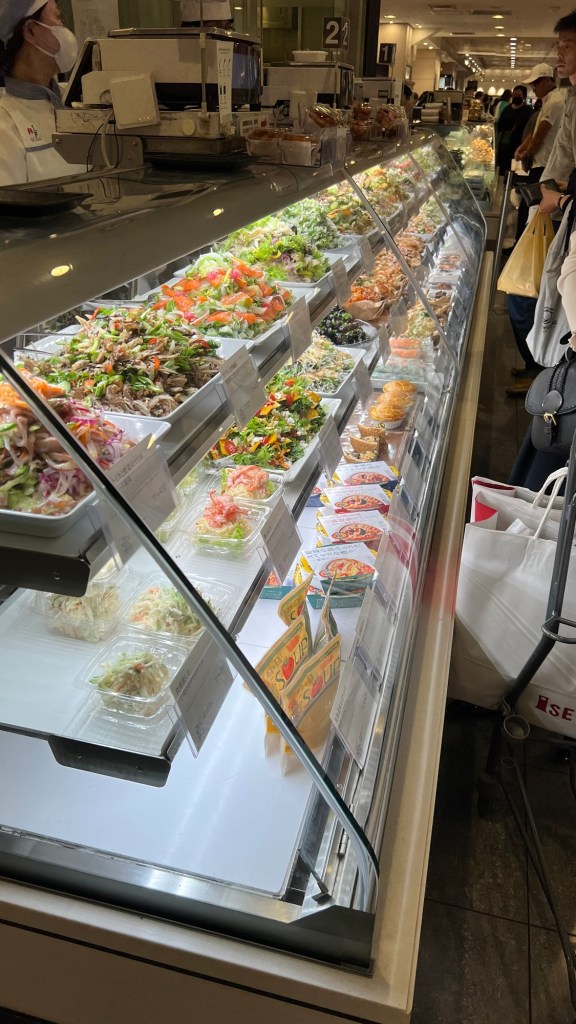 After our time at the park, we went back into the city for lunch and had a bento box, with a meal comprising rice, meat and some tempura. Added to this we had pickled vegetables with some gyoza and yakitori. The depachika delicacy was found at the barely of a department store where we got high quality ingredients.