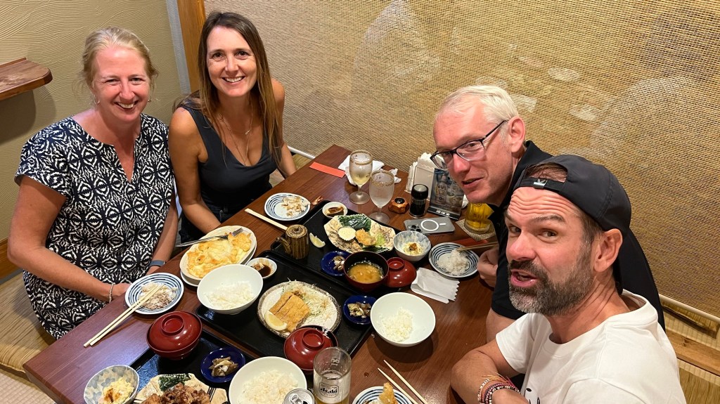 After an enormously enjoyable day in the mountains, we visited a nearby traditional Japanese restaurant with shoji/sliding partition doors and walls for ultimate privacy. The food provided a great selection of fried chicken, tempura seafood and pork katsu with a range of side dishes. All helped down by some local wine and a few Asahi Super Dry beers.