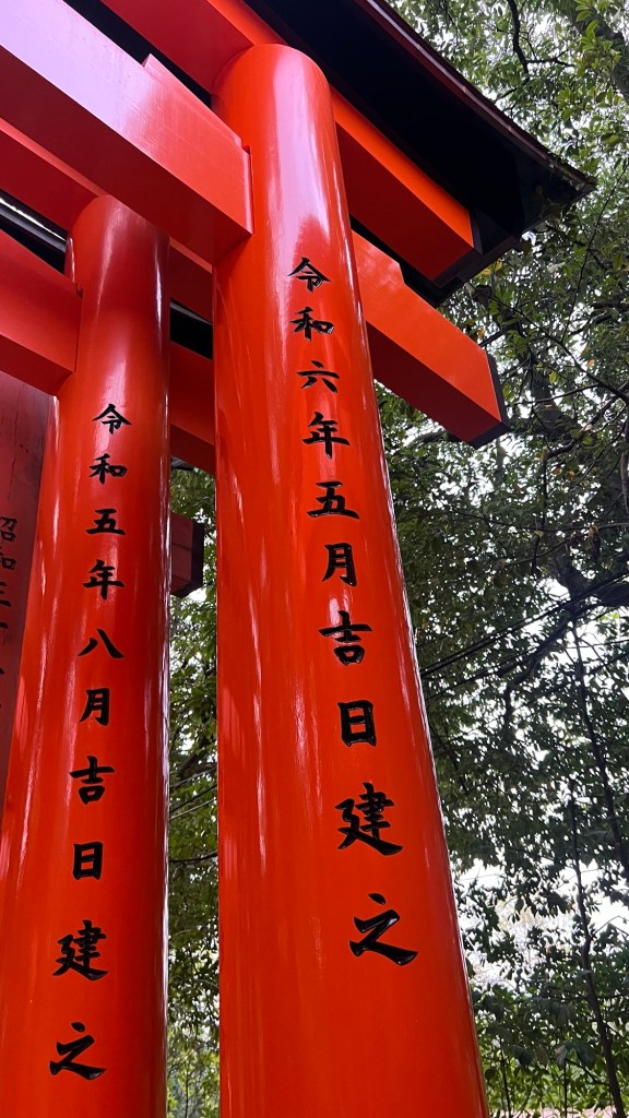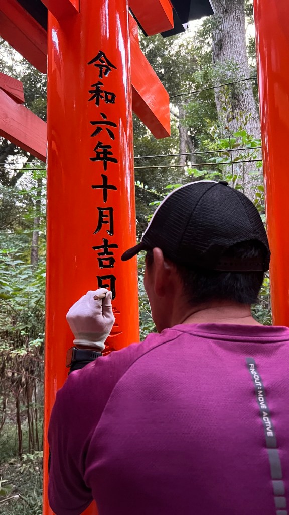 From what we were able to ascertain, each vermillion torii gate can be purchased and an inscription placed on it by the person donating.