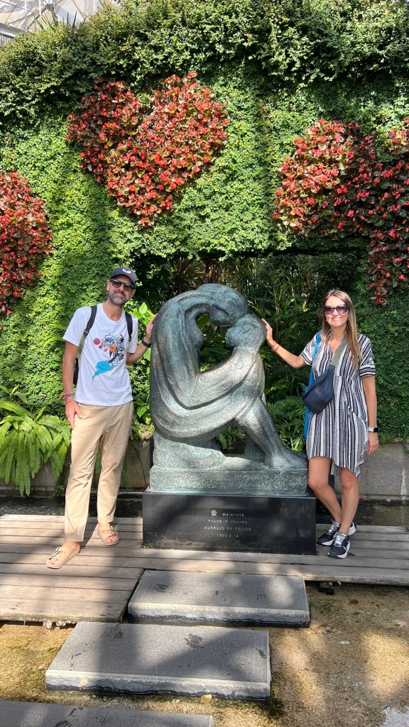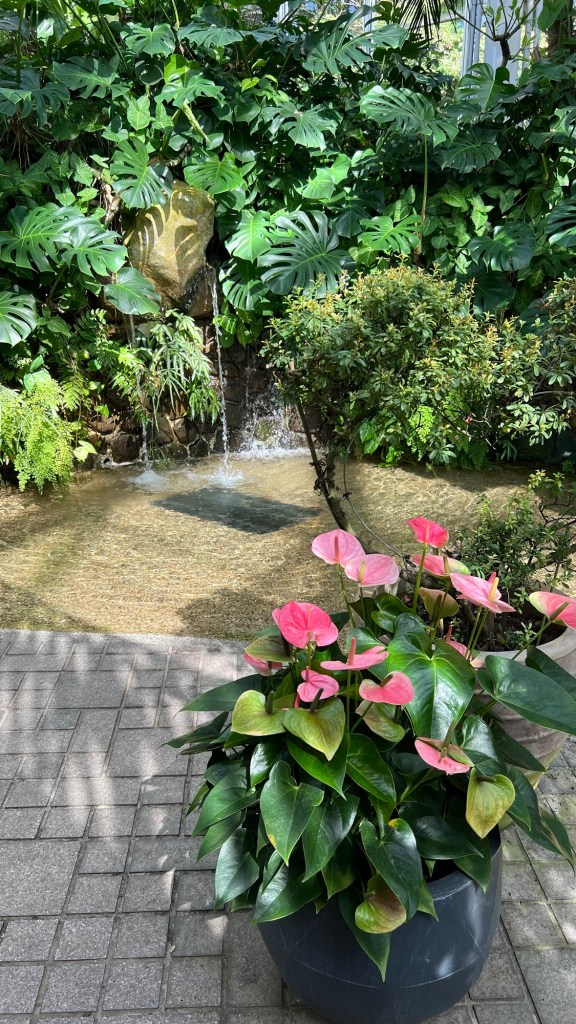 We then went for a quick circuit of the larger greenhouse to marvel at the water features and a special sculpture of a mother and daughter with heart shaped flowers growing amongst the greenery above.