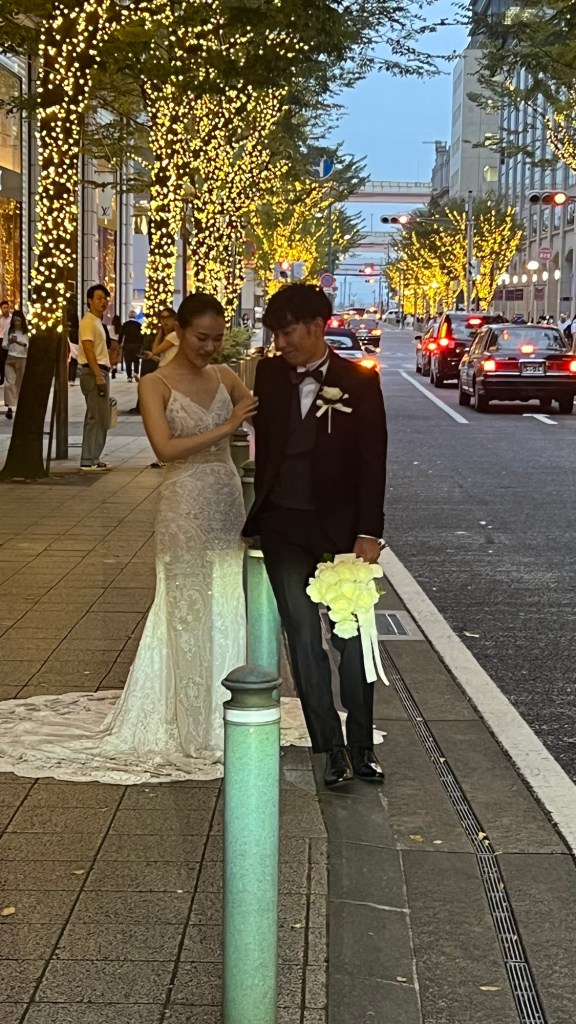 For reasons unknown we witnessed a number of couples recently married having their photos taken on the street with all the fairy lights.