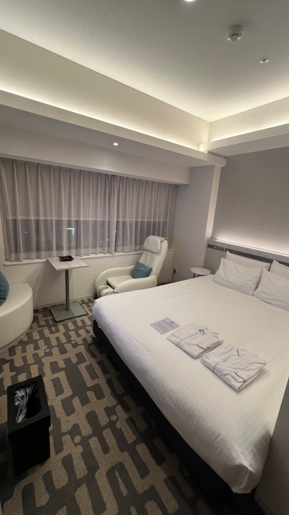 Back at the hotel, we managed to check in and were impressed by a well equipped if small room. Certainly we’ve never had so many charging points and a massage chair, as well as free chocolates, for just £40 for the night’s stay.