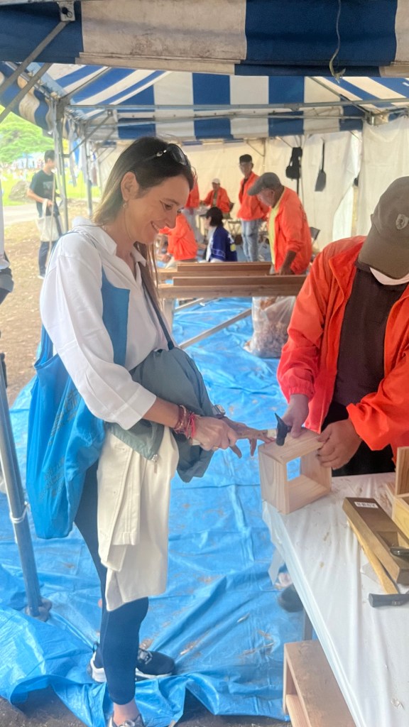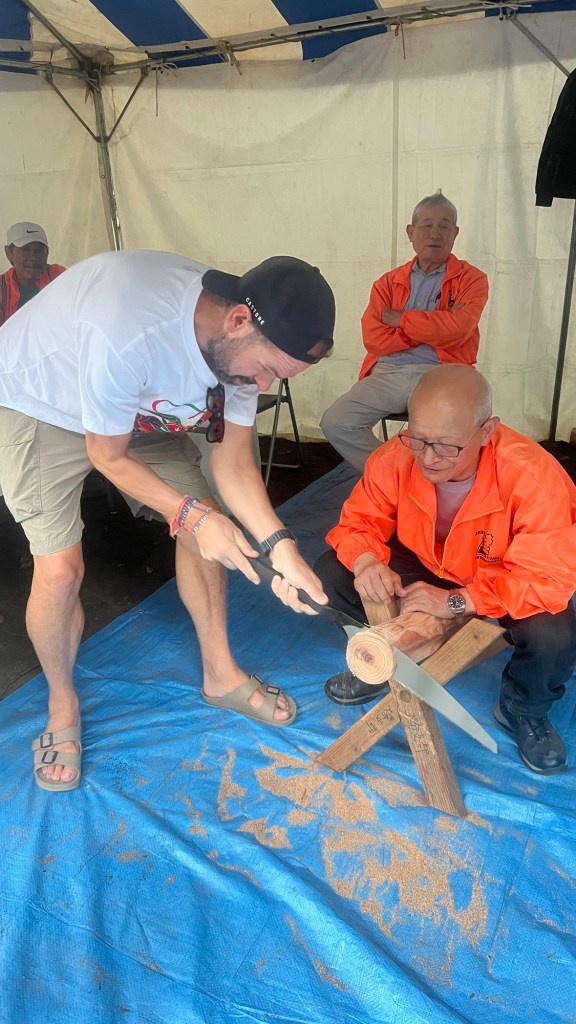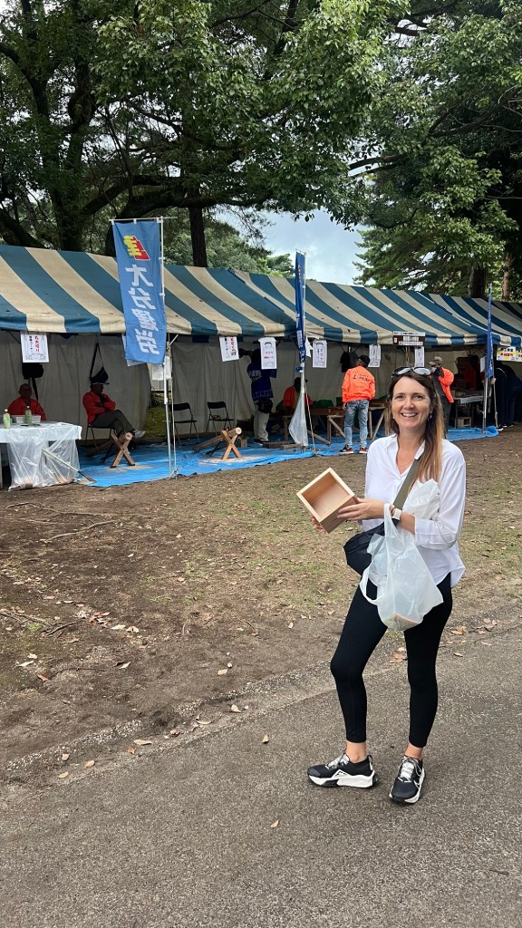 From there we headed up the hill to Beppu Park, where stalls & a market were selling local food produce as well as promoting activities for all, such as woodworking and cooking. Andy got in on the act and had a go at making a wood coaster (!), whilst Michelle made a little wooden box for storage, sadly due to limited space in our bags we had to leave the box behind.