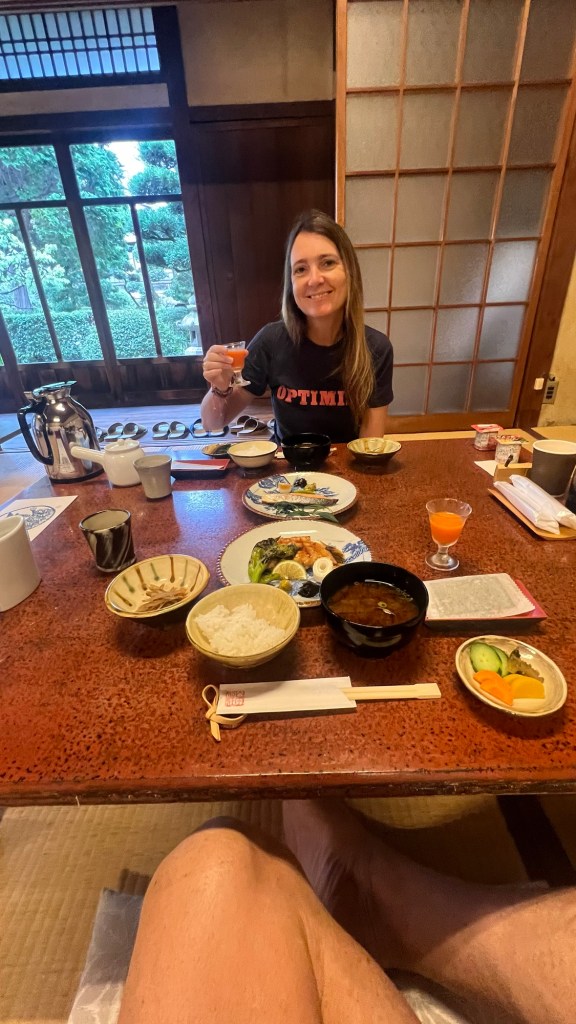 This morning we started with a Japanese breakfast. Keeping with tradition we sat at a low level dining table and were treated to a savoury dish extravaganza. This included steamed rice, miso soup, grilled fish, pickles, nori (seaweed), with a variety of side dishes including boiled egg, tofu and vegetables, finishing with a fruit salad to clean the palette.