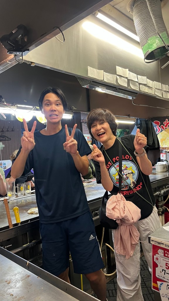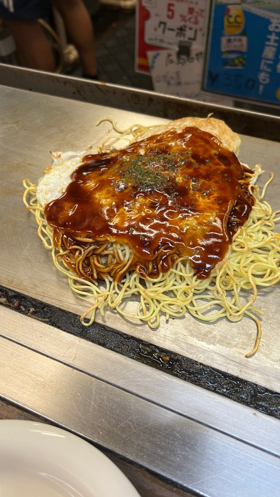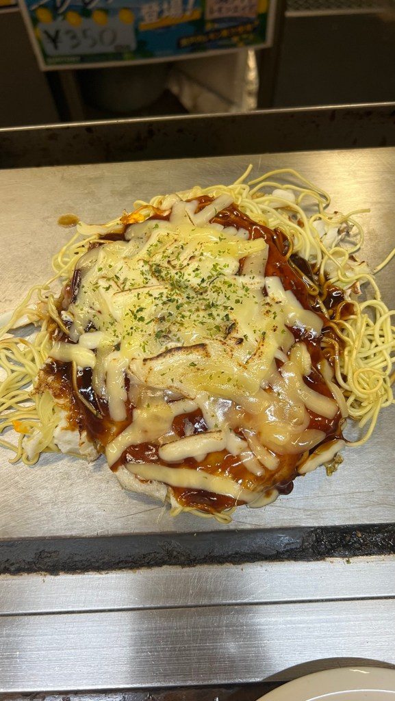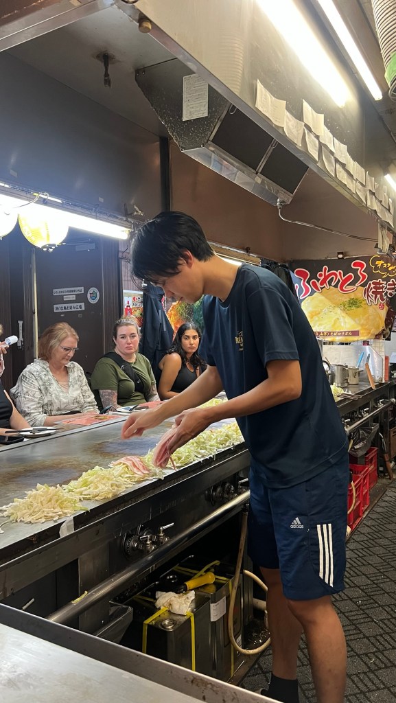 Early evening we went out as a group for some street food at a nearby restaurant where we tried a local delicacy, Okonomiyaki. A savoury pancake with pork, cheese cabbage, bacon and noodles.