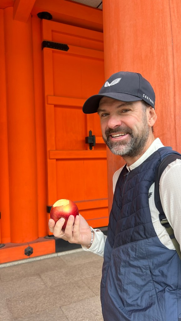 After about a 30-45 minute ascent and a gradual descent we’d seen our fair share of torii gates. Our next stop was a walk to the Gion district and a brief food stop to buy one of the largest apples we’ve ever come across. Fruit in Japan is incredibly tasty and flavourful, but this comes at a cost with a single apple costing almost 330 yen (£1.60).