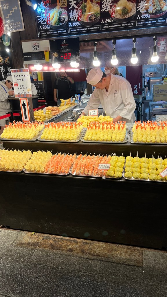 Some of the shops give out free samples or sell sample dishes and skewers which you have to eat there and then.